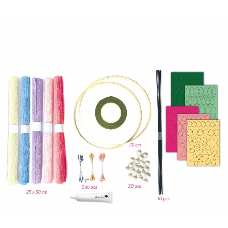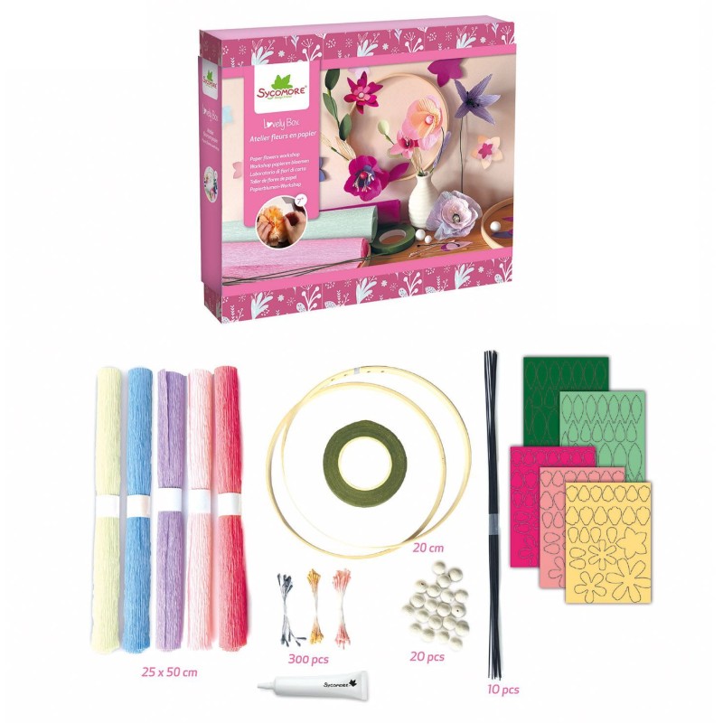 Découvre l'art des fleurs en papier avec cette Lovely Box SYCOMORE. Apprends a confectionner plus de 20 variétés de fleurs et réalise des couronnes, bouquets et frises décoratives. Le kit contient du papier crépon, des cercles en bambou, des pistils, des tiges, de la colle et une notice pour des créations pleines de charme.