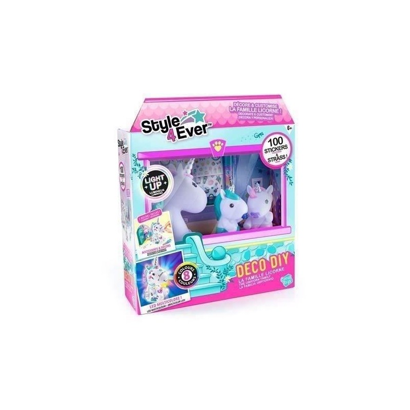 Découvrez le coffret La Famille Licorne de Canal Toys, comprenant une maman licorne lumineuse et deux bébés a personnaliser. Utilisez les autocollants pailletés et les feutres pour décorer vos figurines. Les bébés brillent dans le noir, offrant une expérience magique aux enfants des 3 ans.