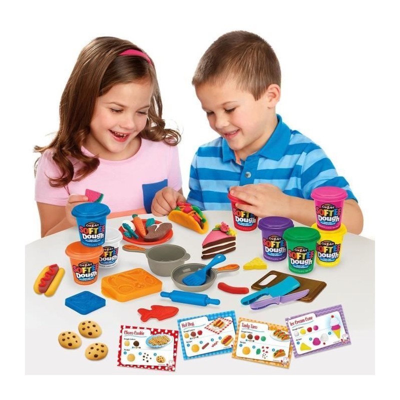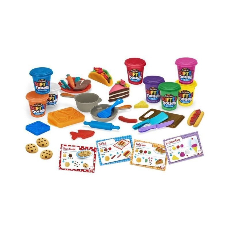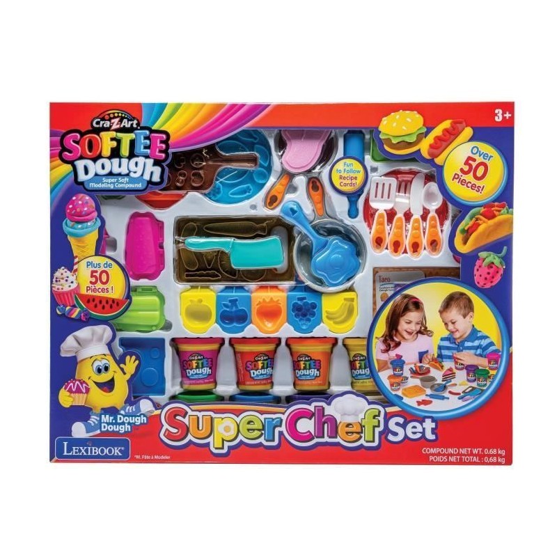 Le kit Super Chef de Cra-Z-Art permet aux enfants de créer des aliments réalistes avec 8 pots de pâte a modeler Softee Dough. Comprend 20+ accessoires : moules (fruits, légumes, burger), ustensiles de cuisine et recettes. Stimule l'imagination et l'apprentissage des couleurs !