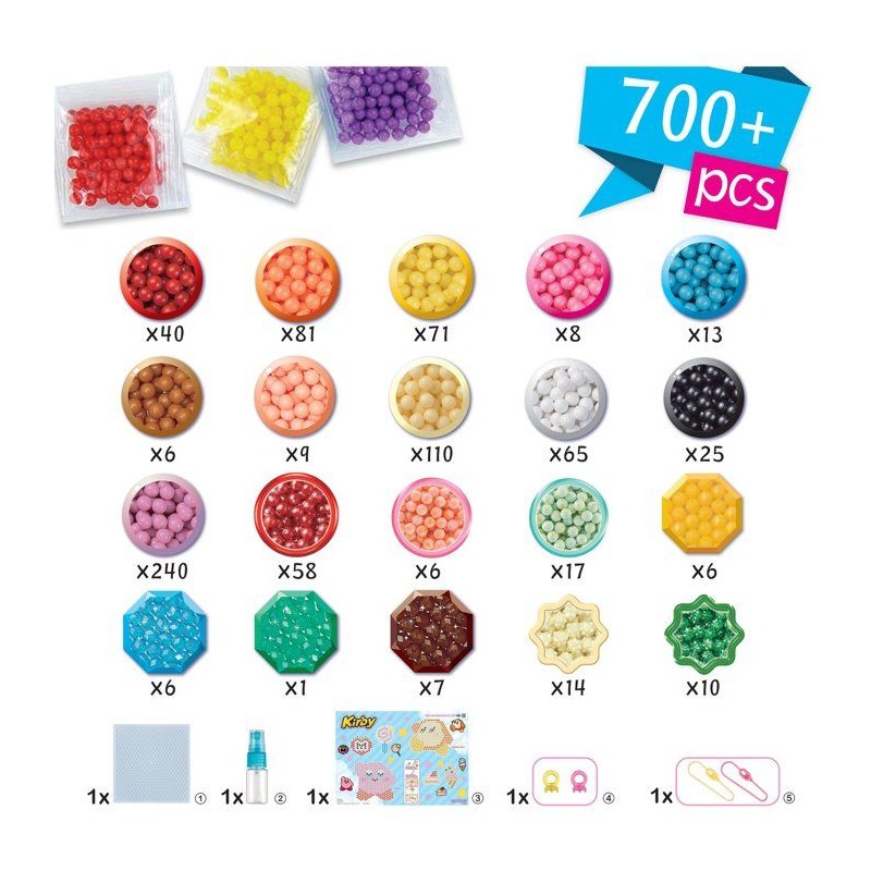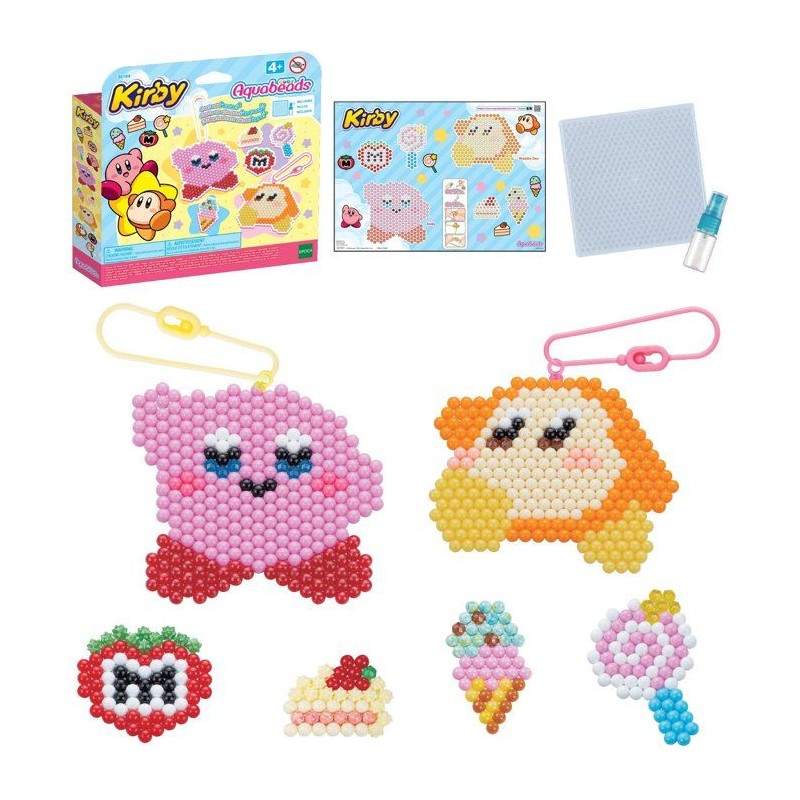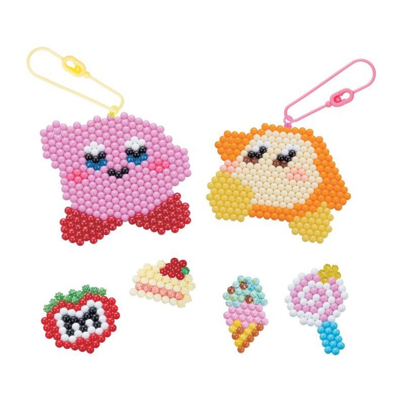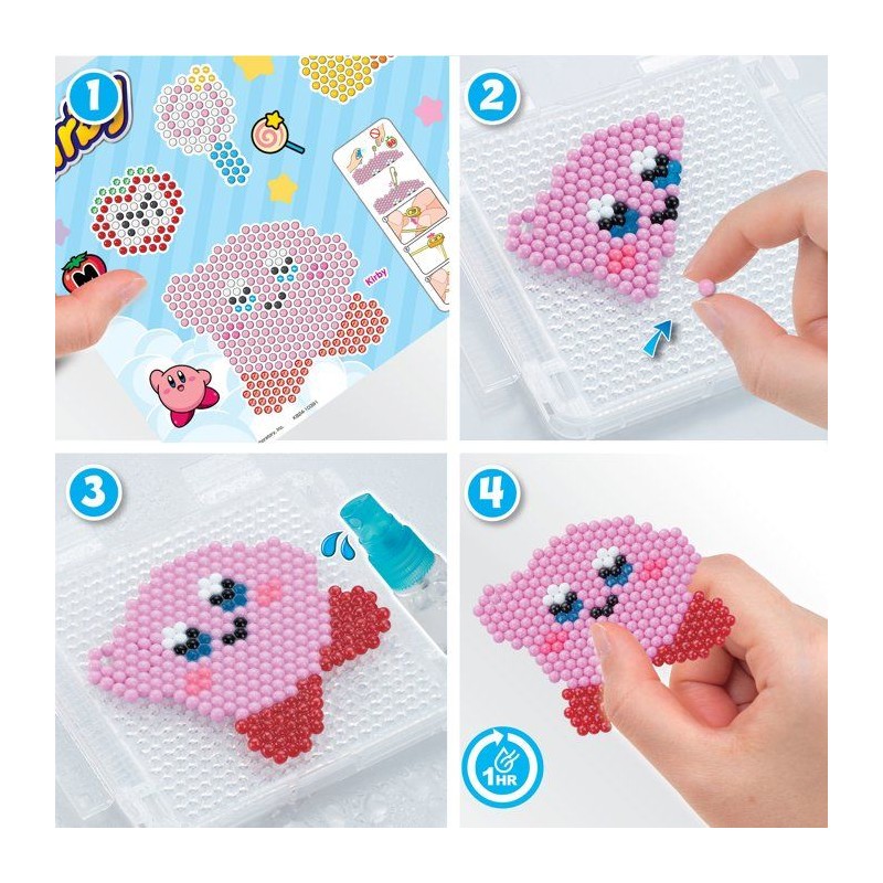 Retrouve l'univers gourmand de Kirby ! Tu peux créer Kirby et ses amis leur faire vivre de nouvelles aventures sucrées. Le principe est simple : assemble les perles, vaporise de l'eau, laisse sécher, et c'est pret ! Il suffit ensuite de clipser ta création sur une attache pour lui donner vie et l'accrocher a ton sac, ta trousse ou tes clés !