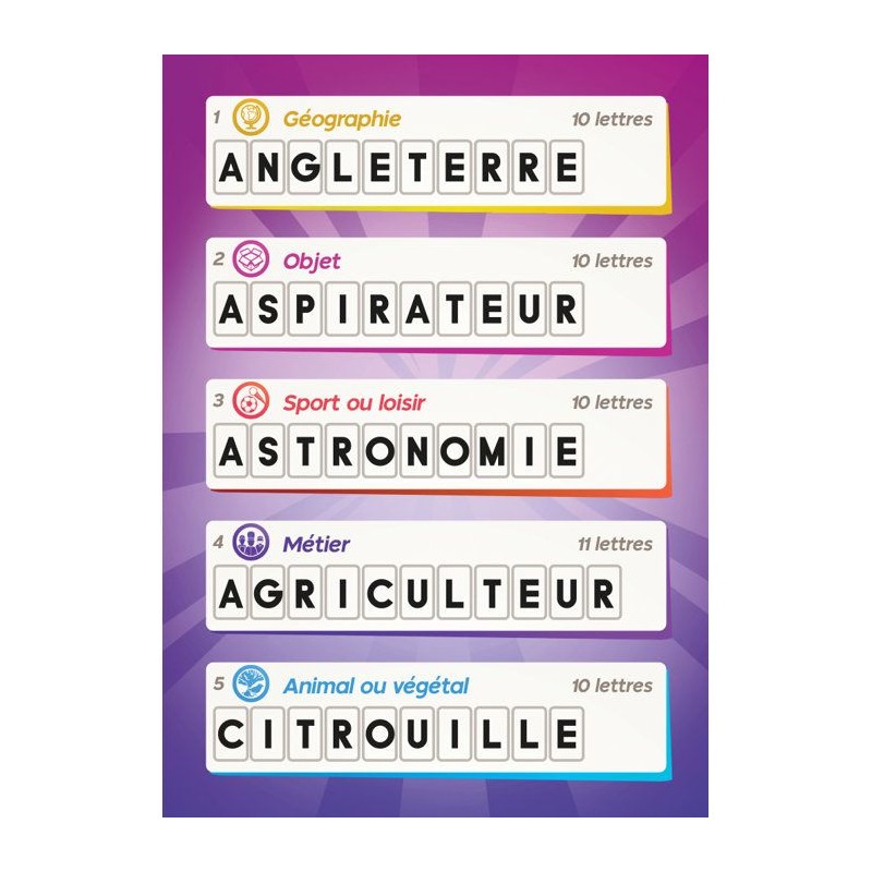 Le principe : les joueurs devinent le plus de mots possible comme au pendu et grâce a des indices qui les mettent sur la bonne voie. Une équipe composée de deux capitaines doit faire deviner des mots aux autres joueurs. a tour de rôle, les joueurs proposent une lettre, comme dans le jeu du pendu. Si la lettre proposée ne figure pas dans le mot, les capitaines doivent donner un mot-indice commençant par cette meme lettre pour aider leurs coéquipiers a deviner le mot. L'équipe doit trouver un maximum de mots avant de pouvoir deviner le "mot de la fin", celui qui fait véritablement gagner la partie.Les joueurs disposent de 12 chances pour proposer des lettres. Le nombre de mots trouvés détermine le nombre de lettres qu'ils pourront ensuite proposer pour trouver le "mot de la fin" lors de la phase finale. Un jeu coopératif qui mele lettres et indices, idéal pour travailler le vocabulaire de maniere ludique et engageante.Contenu : 70 cartes, 2 feutres effaçables, 3 jetons bonus, 20 cartes effaçables, 1 tuile décompte des lettres proposées, 1 regle du jeu dans une boîte cartonnée (10 × 15 × 3,5 cm).