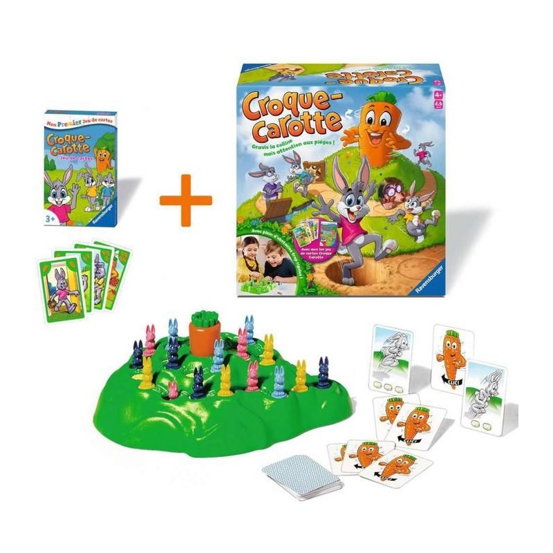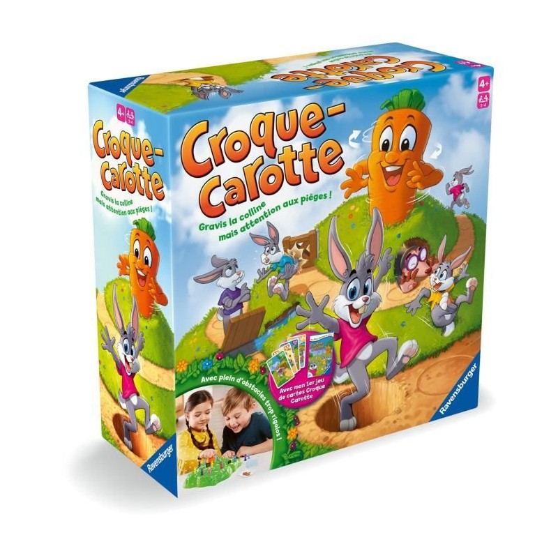 C'est parti pour une course de lapins completement folle ! Ton objectif : la succulente carotte au sommet de la colline. Mais attention, le chemin qui mene jusqu'a elle est plein de surprises : de temps en temps, des trous s'ouvrent et boum, les lapins tombent dedans, ou une taupe sans-gene les pousse sur le côté. Un pont-levis et une clôture peuvent aussi gener le passage. Quel petit lapin atteindra le premier la carotte ? En bonus : inclus un jeu de cartes inédit ! Croque Carotte est considéré comme un classique des jeux pour enfants avec ses diverses nominations et plus de 10 millions d'exemplaires vendus. Les regles sont simplissimes et s'apprennent en quelques secondes seulement ! Une fois le matériel installé sur la table, toute la famille est prete a jouer. Ce jeu permet d'initier en douceur les enfants aux premiers jeux de société. Apres quelques parties et une fois que les enfants sont a l'aise avec le matériel de jeu, ils sont meme capables de jouer seuls sans avoir besoin d'un adulte !