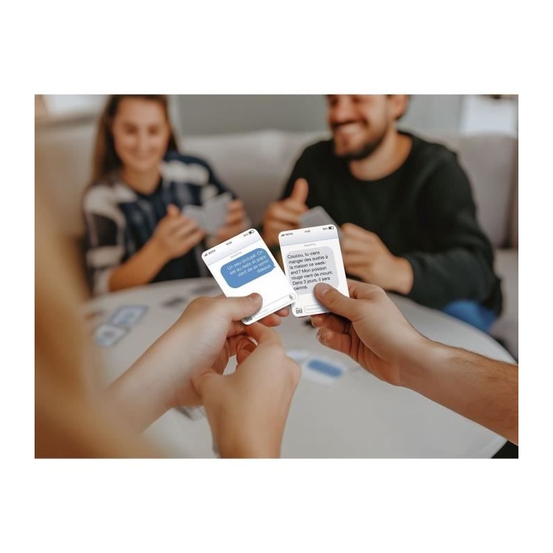 Avec NEW PHONE WHO DIS®, pas besoin de réseau pour échanger des SMS a se tordre de rire ! Le juge-arbitre choisit une carte-message REÇU et la lit a voix haute au groupe. Tous les autres joueurs proposent une de leurs 7 carte-message ENVOYÉ en guise de réponse. Le juge-arbitre choisit sa réponse préférée a chaque tour. Le gagnant conserve la paire gagnante comme point. 2 modes de jeu : Classique and Do It Yourself ! Des milliers de combinaisons hilarantes !