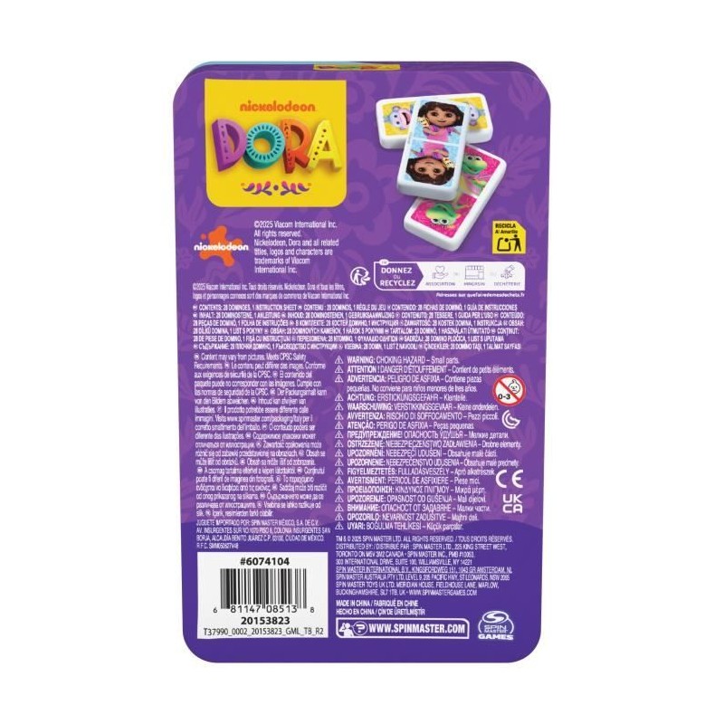 Un grand classique pour jouer entre enfants ou en famille. Contient 28 dominos plastiques de belle qualité, avec des graphismes colorés a l'effigie des personnages de Dora et ses amis. De 2 a 4 joueurs. Conditionné dans une belle boîte métallique. A partir de 4 ans.
