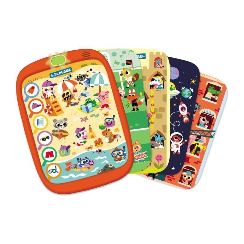 Un cherche et trouve électronique tactile avec plus de 100 questions ! Trouve le bon détail avec tes doigts et regarde si la lumiere s'allume.