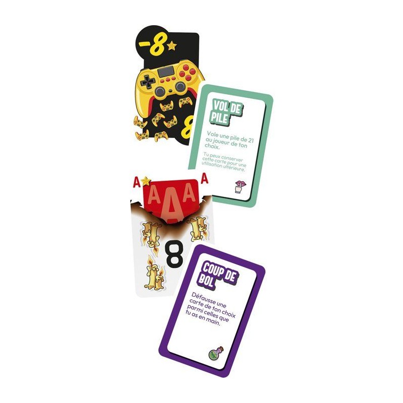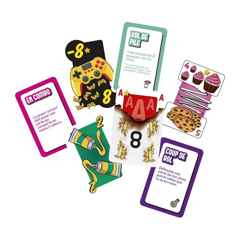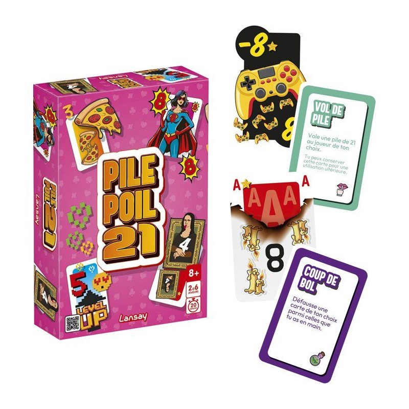 Pile Poil 21, le jeu de cartes qui te retourne le cerveau ! Un jeu de cartes ? Pas tout a fait. Dans Pile Poil 21, les cartes sont farfelues, les regles simples... et les retournements de situation garantis ! Des rois en lunettes de soleil, des dames qui tirent la langue, des pizzas a la place des trefles... et surtout des cartes spéciales qui viennent tout chambouler ! Le but ? etre le premier a atteindre exactement 21 pour remporter la pile. Mais entre les cartes a plusieurs valeurs, les effets déjantés et les attaques surprises des adversaires... rien ne se passe jamais comme prévu ! Un jeu rapide, fun et super malin, a sortir a toutes les occasions. Rires assurés a chaque partie !