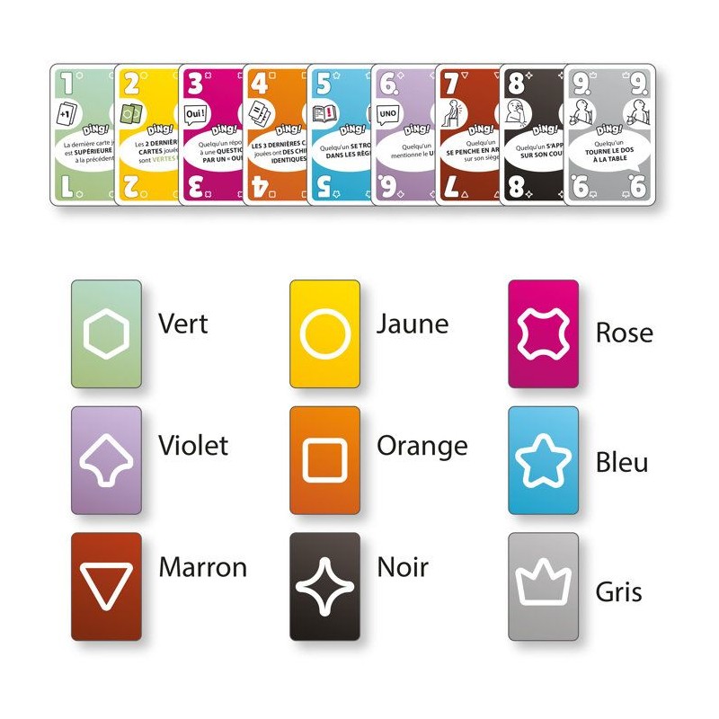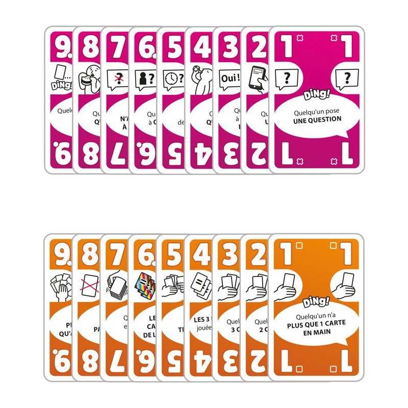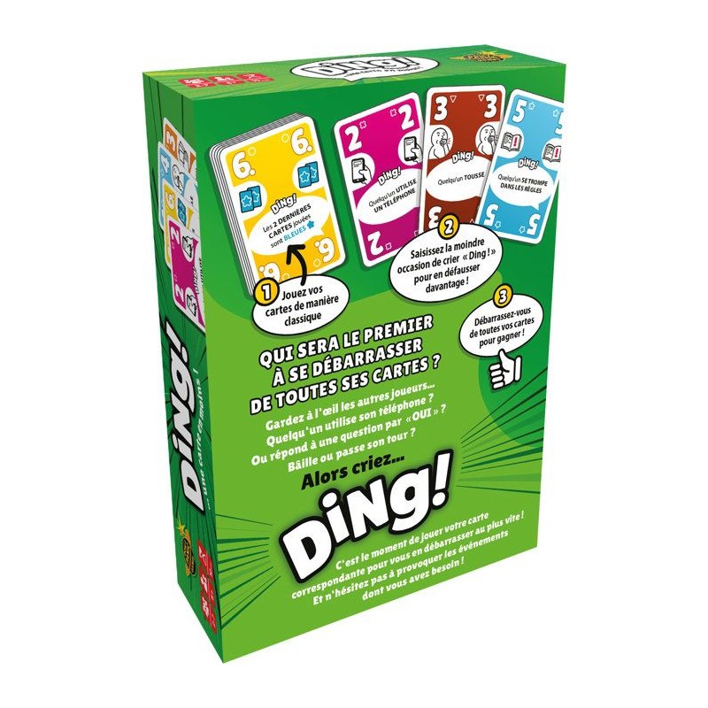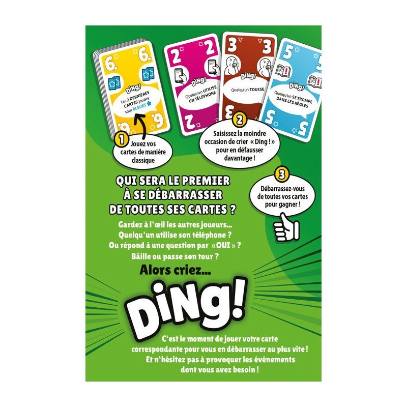 Soyez le premier a vous débarrasser de vos cartes. A votre tour, jouez une carte de meme couleur ou meme valeur que celle du centre. Sur chaque carte est aussi mentionnée une action telle que "quelqu'un répond oui" ou "quelqu'un tousse". Si ce fait survient, criez "Ding!" et débarrassez vous immédiatement de la carte.