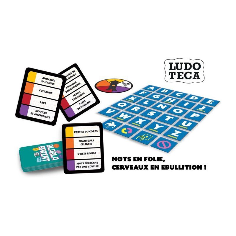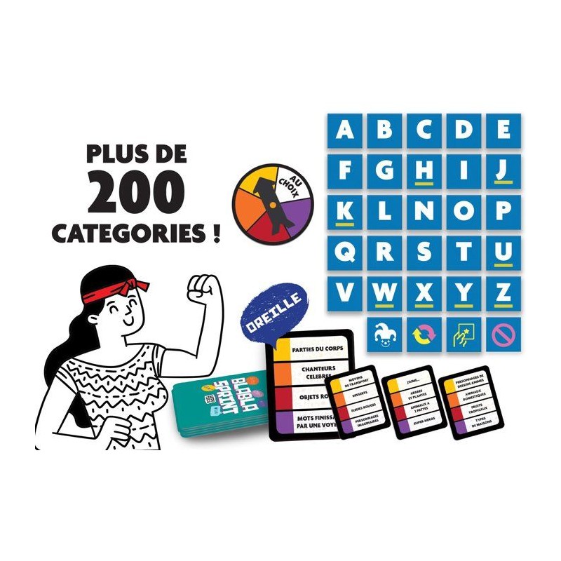 Un jeu de mots rapide et intense où ta créativité et ta rapidité font toute la différence ! _x000B_Fais tourner la roulette pour choisir ta difficulté, puis trouve un mot commençant par la lettre donnée et correspondant a la catégorie. Mais attention, chaque seconde compte, et les cartes spéciales peuvent changer la donne : joker, échange ou saut de tour... Saurez-vous tenir la cadence ? _x000B_Blabla Sprint, c'est l'adrénaline du langage et des idées en un seul jeu ! 20 min | 2 a 6 joueurs | 10+ ans