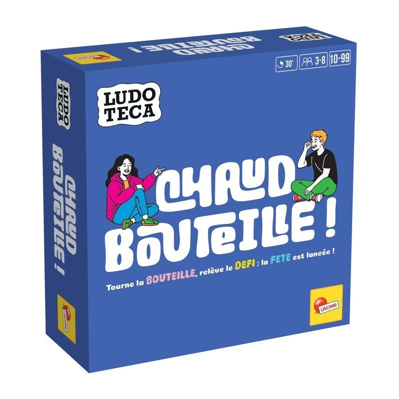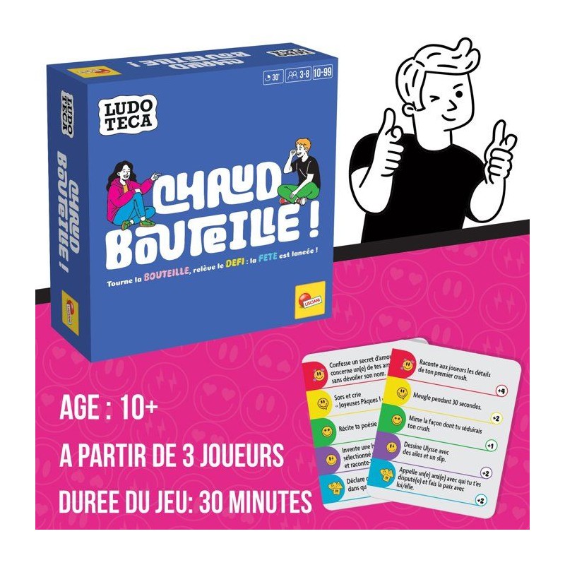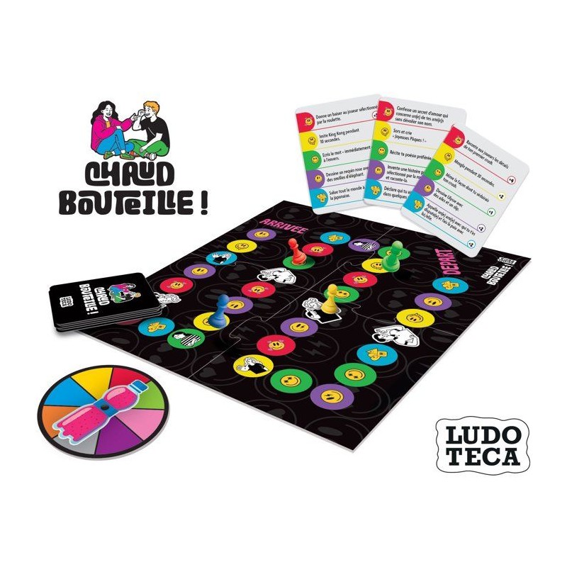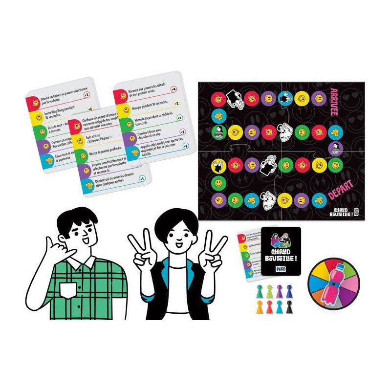 Prépare-toi a relever des défis fous avec Chaud Bouteille !, un jeu d'activités variées qui mettra ton audace a l'épreuve. _x000B_Tour a tour, réalise des défis d'amour, d'humour, de créativité ou d'amitié, choisis tes cibles avec la roulette, avance sur le plateau... ou recule si tu échoues ! _x000B_Un jeu parfait pour animer les fetes, renforcer les liens et surtout... s'amuser sans retenue ! 30 min | 3 a 8 joueurs | 10+ ans