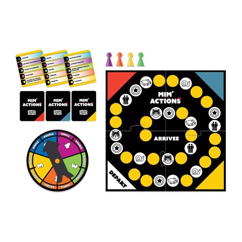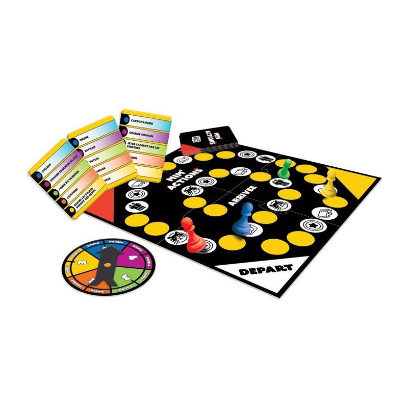 Prépare-toi a vivre un moment hilarant et plein de défis avec Mim'Actions ! Mime des objets, expressions, ou actions simples, ou combine-les pour encore plus de fun !_x000B_Avec sa roulette ludique, ses cartes simples et doubles, ses jetons BONUS a utiliser stratégiquement, ce jeu fera de toi le roi (ou la reine) du mime. Attention aux cases spéciales : équilibre, chaton miaulant, ou mimiques au ralenti, c'est la garantie de parties folles en famille ou entre amis !_x000B_Qui sera le meilleur mime ? a toi de jouer ! 30 min | 2 a 4 joueurs | 8+ ans