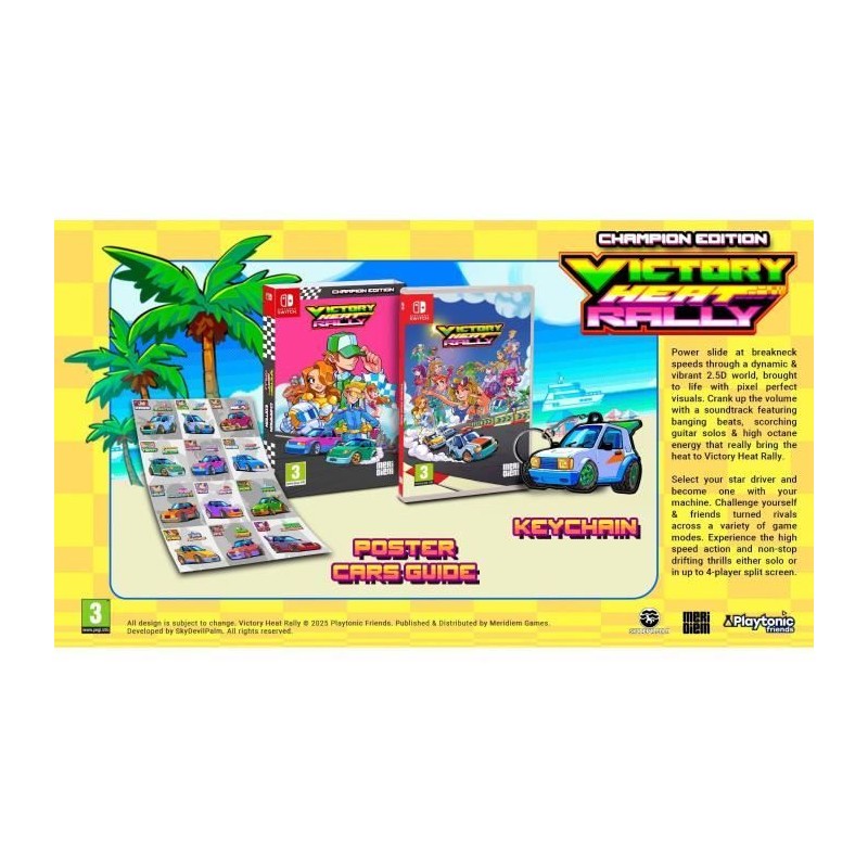 Découvrez Victory Heat Rally - Champion Edition sur Nintendo Switch, un jeu de course arcade au style rétro. Affrontez des circuits dynamiques avec des pilotes uniques et des véhicules stylisés. Profitez de nouveaux circuits et options de personnalisation. Jouez en solo ou en multijoueur local dans une ambiance pixel art HD. La victoire vous attend !