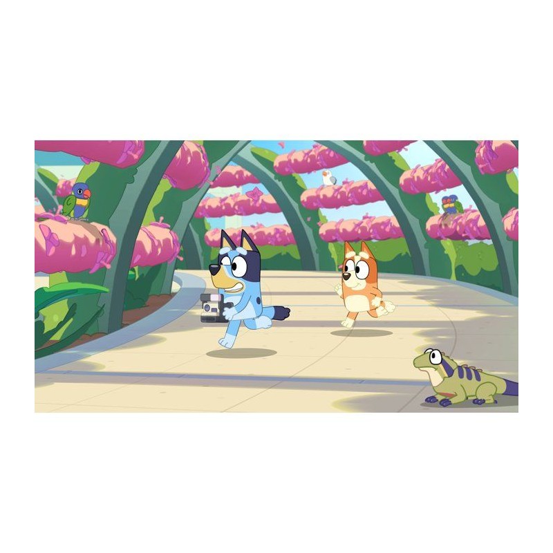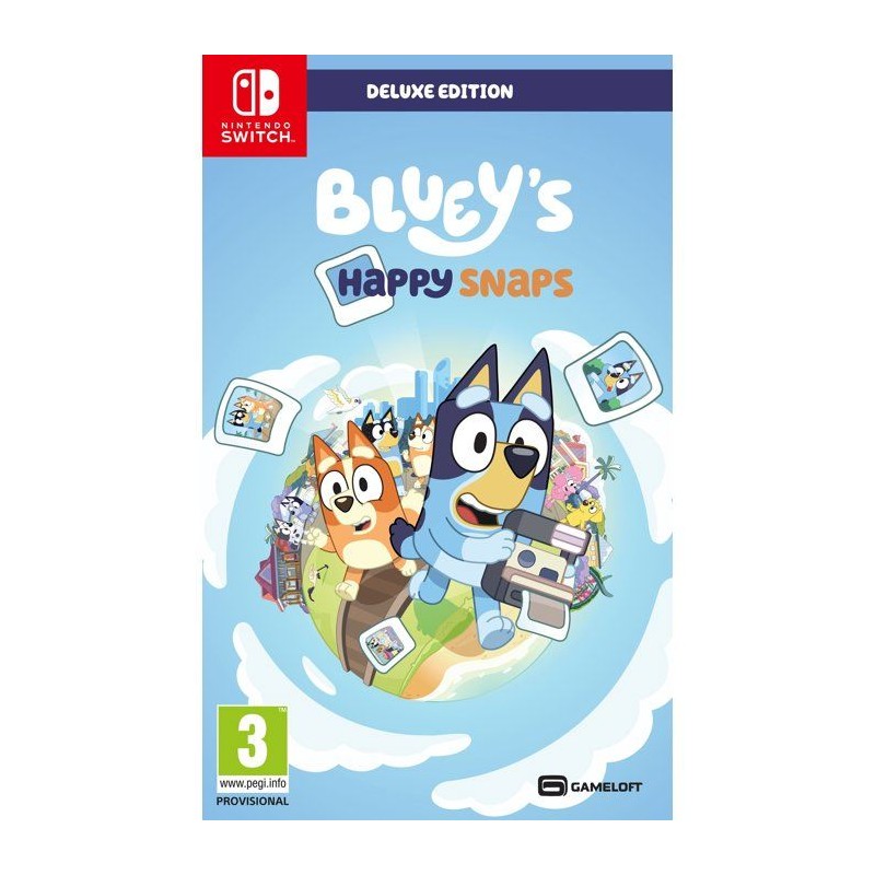 C'est le moment de jouer ! Explorez, amusez-vous et capturez vos moments préférés avec Bluey et Bingo dans ce jeu rythmé par les photographies. Vous retrouverez des lieux de la série, créerez votre propre album et changerez les photos souvenirs dans le jeu en véritables moments ludiques. L'Édition Deluxe apporte encore plus de rires, de déguisements et de fun avec Bluey dans votre aventure. Voila les grands-meres qui arrivent : du contenu exclusif dans le jeu, inspiré des fauteuses de troubles préférées de tous. Objets de déguisement bonus : plus de costumes et de looks rigolos a composer ensemble. Artbook virtuel de Bluey's Happy Snaps : un aperçu en coulisse des illustrations et des idées qui ont inspiré l'aventure.