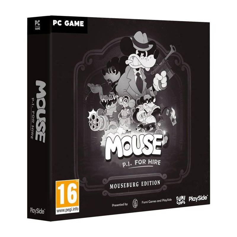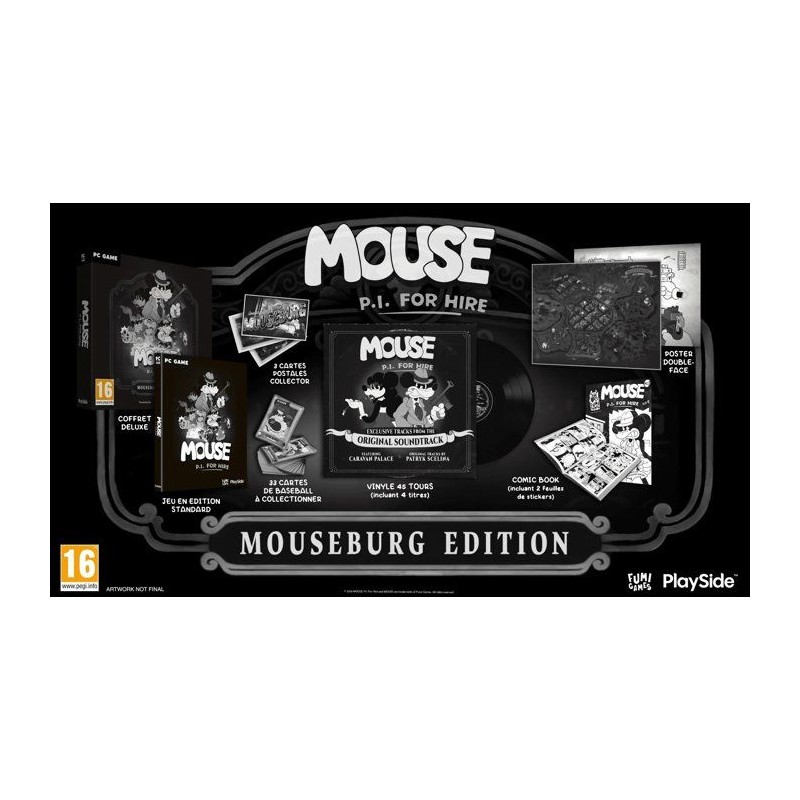 MOUSE : P.I. For Hire est un jeu de tir a la premiere personne débordant d'action qui s'inspire des cartoons des années 30. Son animation rétro en noir et blanc est dessinée a la main, image par image, afin d'offrir une esthétique vintage saisissante.\n\nNaviguez entre les couches de corruption dans cette histoire de détective passionnante aux aspects de film noir, avec des environnements dynamiques a explorer, une bande originale jazz orchestrale ainsi qu'un arsenal bien chargé d'armes cartoon et de bonus destructeurs.\n\nUne Mouseburg Edition remplie de bonus physiques exclusifs\n- Un lot de trois cartes postales inspirées des années 1930, représentant des lieux emblématiques du monde de Mouseburg.\n- Une affiche recto-verso (340 mm x 340 mm) avec une carte de Mouseburg au recto et un schéma du fidele pistolet « Micer » de Jack Pepper au verso.\n- 33 cartes de baseball a collectionner Mouseburg, inspirées des cartes a collectionner et du mini-jeu présents dans le jeu.\n- Un vinyle 7" comprenant quatre pistes de la bande-son officielle du jeu, avec des morceaux entierement originaux du compositeur Patryk Scelina, ainsi qu'un tout nouveau titre écrit spécialement pour le jeu par les icônes de l'electro-swing, Caravan Palace.\n- Une bande dessinée imprimée MOUSE : P.I. For Hire, incluant 2 planches d'autocollants.\n- Le jeu vidéo sous forme de code STEAM pour PC, incluant tout le contenu de l'édition Mouseburg et emballé dans une boîte Premium de collection.