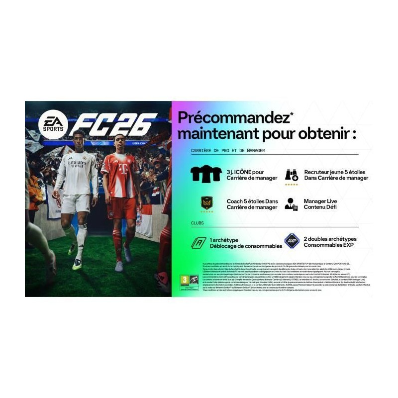 EA SPORTS FC 26 est un jeu vidéo de sport sur PS5, édité par Electronic Arts. Préparez-vous a vivre des matchs palpitants avec un mode en ligne et un support Blu-Ray. Sortie prévue le 26 septembre 2025, ce jeu est classé PEGI 3+.