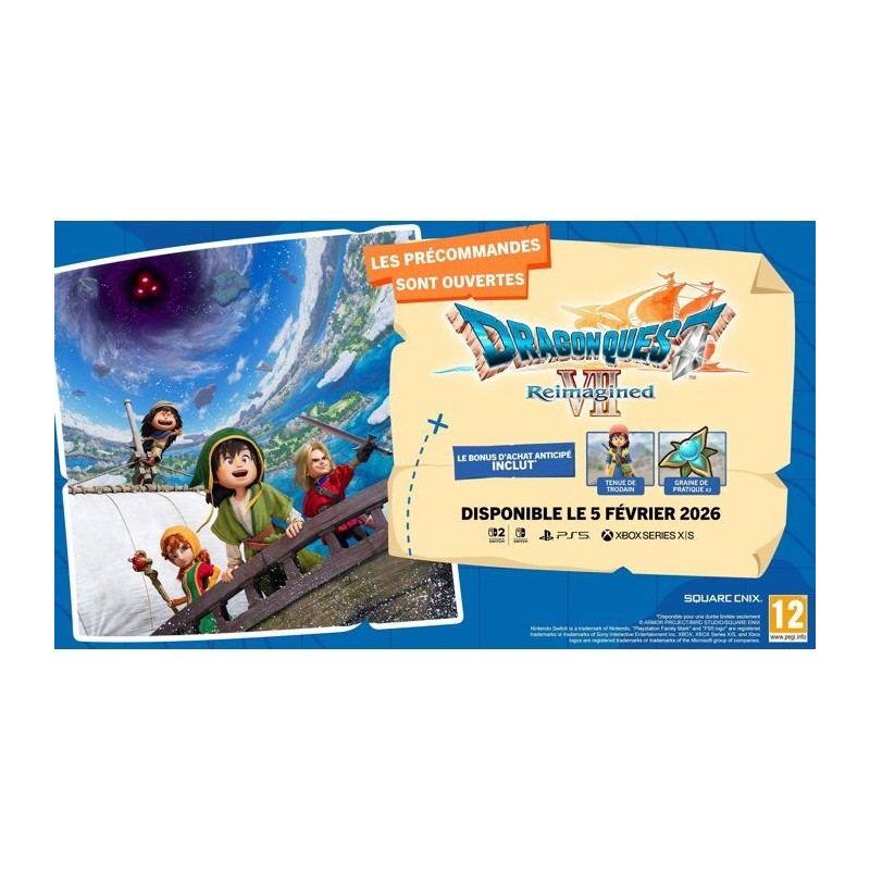 « Le monde ne se résume pas a cette île... et on va le prouver ! » Embarquez pour une histoire où se melent le passé et le présent dans DRAGON QUEST VII Reimagined ! Incarnez le jeune fils plein de curiosité d'un pecheur, qui n'a jamais rien connu d'autre que la paisible île de Melyor. Votre voyage commence par une simple question : le monde se résume-t-il a cette île ? Partis en quete de réponses avec vos amis d'enfance, vous découvrez le sanctuaire des Mysteres et remontez dans le temps. Vous allez alors faire une terrible découverte : des contrées entieres se sont retrouvées coupées du reste du monde par une force maléfique. Le destin de la planete est entre vos mains. DRAGON QUEST VII Reimagined remet un jeu culte au goût du jour d'une façon inédite, avec de charmants graphismes en diorama, un gameplay repensé et une histoire plus simple a suivre. Pour les aventuriers plus expérimentés, redécouvrez l'histoire de ces compagnons courageux avec tous leurs moments de joie et de peine. Pour les héros débutants qui souhaitent découvrir la série DRAGON QUEST, vous avez choisi le jeu idéal.