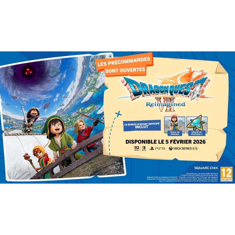 « Le monde ne se résume pas a cette île... et on va le prouver ! » Embarquez pour une histoire où se melent le passé et le présent dans DRAGON QUEST VII Reimagined ! Incarnez le jeune fils plein de curiosité d'un pecheur, qui n'a jamais rien connu d'autre que la paisible île de Melyor. Votre voyage commence par une simple question : le monde se résume-t-il a cette île ? Partis en quete de réponses avec vos amis d'enfance, vous découvrez le sanctuaire des Mysteres et remontez dans le temps. Vous allez alors faire une terrible découverte : des contrées entieres se sont retrouvées coupées du reste du monde par une force maléfique. Le destin de la planete est entre vos mains. DRAGON QUEST VII Reimagined remet un jeu culte au goût du jour d'une façon inédite, avec de charmants graphismes en diorama, un gameplay repensé et une histoire plus simple a suivre. Pour les aventuriers plus expérimentés, redécouvrez l'histoire de ces compagnons courageux avec tous leurs moments de joie et de peine. Pour les héros débutants qui souhaitent découvrir la série DRAGON QUEST, vous avez choisi le jeu idéal.