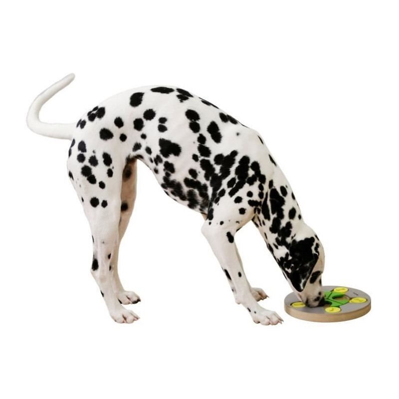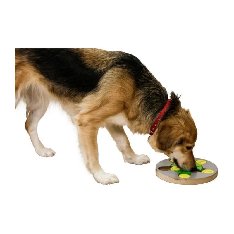 En panneau de fibres de moyenne densité robuste revetu de peinture - Le chien accede aux friandises en faisant coulisser les caches - Dessous antidérapant - Niveau de difficulté : moyen