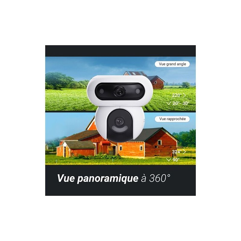 La caméra de surveillance EZVIZ H90 est une solution extérieure motorisée a double objectif offrant une vision panoramique 360°. Avec une résolution 2K, elle assure une surveillance efficace grâce a ses deux caméras rotatives, la vision nocturne infrarouge et une communication audio bidirectionnelle.