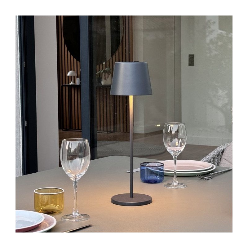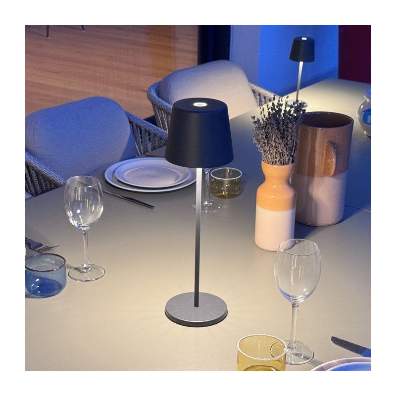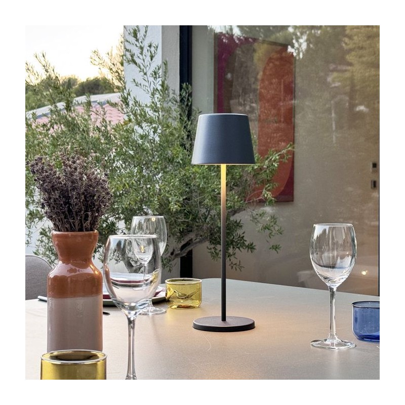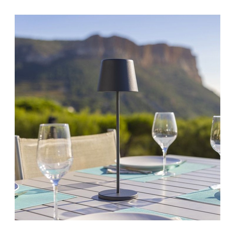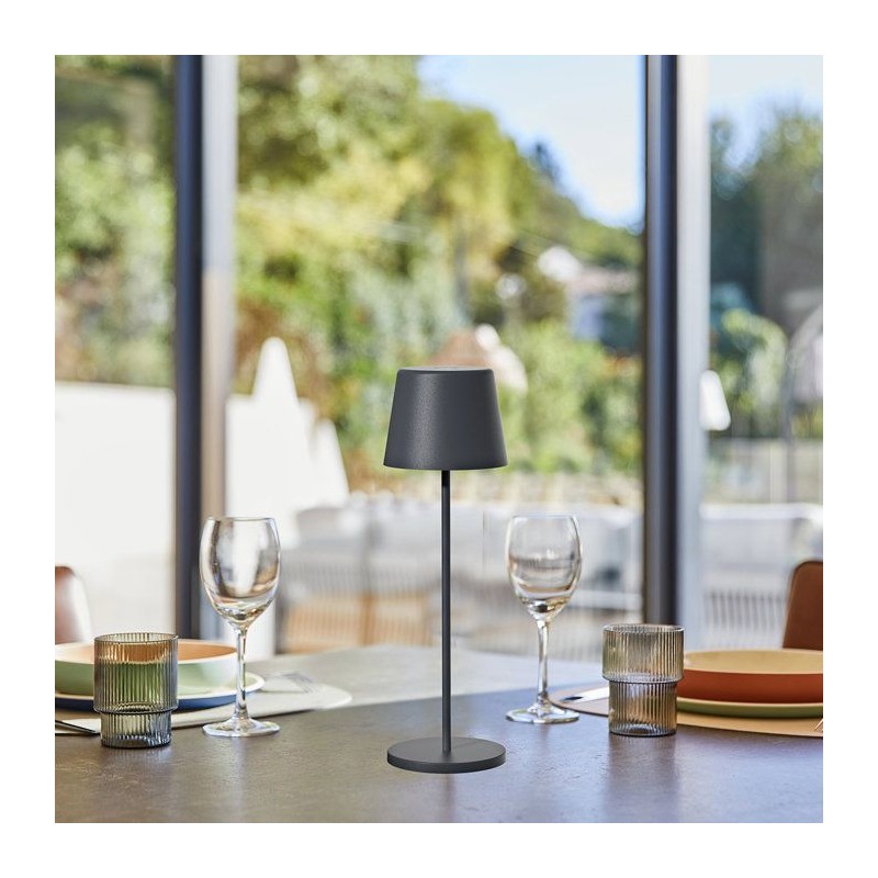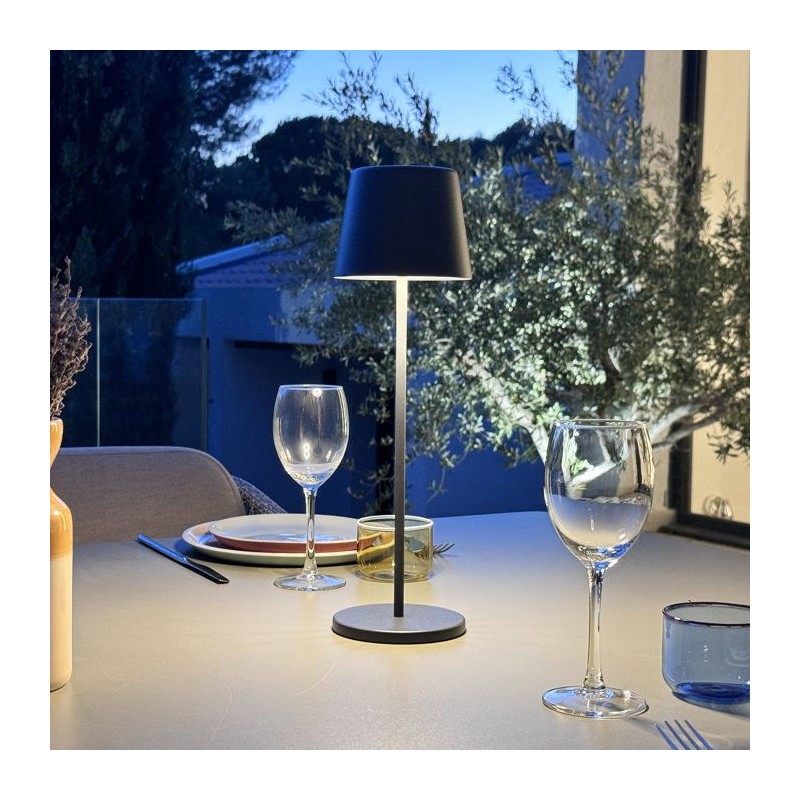 LAMPE DE TABLE LED : KELLY ROCK est une lampe sans fil avec une base LED blanc chaud a intensité variable. Cette lampe a poser se distingue par son design sobre et élégant mais également par sa grande autonomie de fonctionnement (jusqu'a 7 heures). Lampe a poser autonome, elle apportera a votre décoration une touche chic et tendance. Elle est idéale comme lampe de table design, lampe de chevet ou encore pour illuminer vos tables de fetes. UTILISATION EXTERIEUR / INTERIEUR : apres une charge rapide de votre lampe de table KELLY ROCK, vous pourrez utiliser cette lampe design a l'extérieur comme dans la maison. Que ce soit comme lampe d'extérieur pour la terrasse, comme lampe de table pour le salon, comme lampe déco ou comme lampe de chevet dans une chambre d'enfant, la lampe s'adapte a toutes les situations. AUTONOMIE : la lampe de table KELLY ROCK, une fois chargée a son maximum, peut éclairer tout autour de vous pendant pres de 7 heures. Le temps de charge complet de la lampe est de 2 heures avec sa base de chargement sans fil. VARIATEUR D'INTENSITE : la lampe de table KELLY ROCK possede une luminosité blanc chaud a intensité variable, vous permettant d'adapter le degré de luminosité indépendamment sur toutes vos lampes. Cette lampe éclaire vraiment avec son flux lumineux de plus de 230 Lumens. PRATIQUE ET ROBUSTE : la lampe de table est essentiellement composée d'aluminium. Chic et élégante, la lampe LED design, proposée en 5 couleurs : gris, noir, blanc, vert olive et bronze, fait une hauteur totale de 38 cm (largeur 11.3cm). Elle est également protégée contre les éclaboussures (IP54) et résiste aussi aux UV.