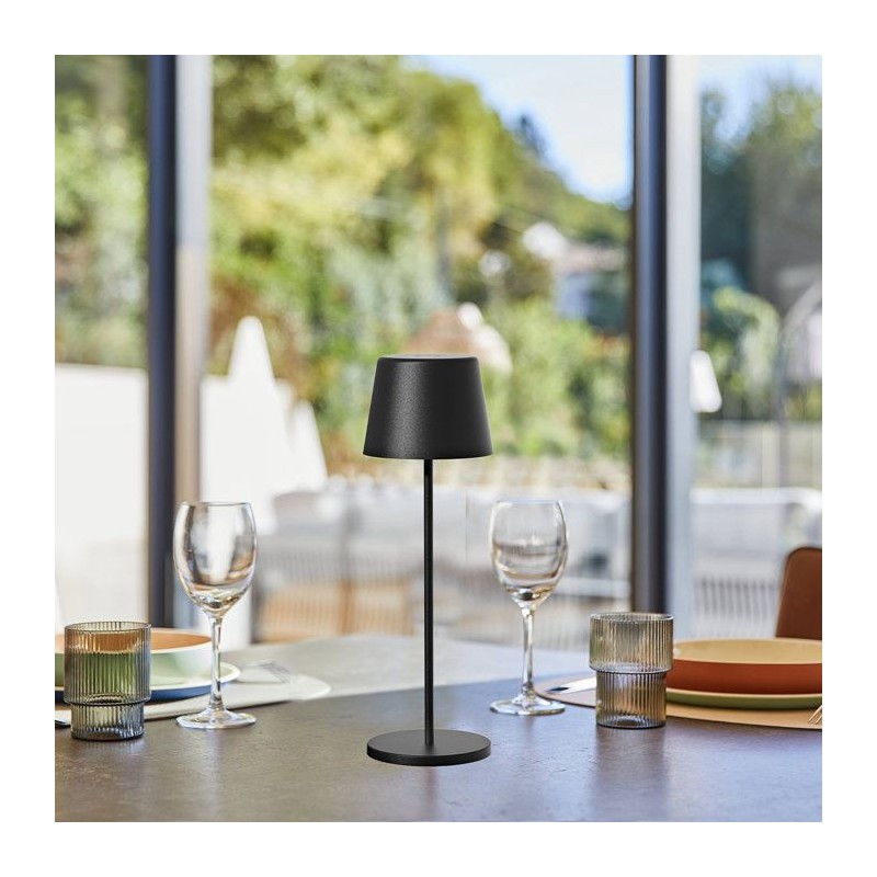 LAMPE DE TABLE LED : KELLY BLACK est une lampe sans fil avec une base LED blanc chaud a intensité variable. Cette lampe a poser se distingue par son design sobre et élégant mais également par sa grande autonomie de fonctionnement (jusqu'a 7 heures). Lampe a poser autonome, elle apportera a votre décoration une touche chic et tendance. Elle est idéale comme lampe de table design, lampe de chevet ou encore pour illuminer vos tables de fetes. UTILISATION EXTERIEUR / INTERIEUR : apres une charge rapide de votre lampe de table KELLY BLACK, vous pourrez utiliser cette lampe design a l'extérieur comme dans la maison. Que ce soit comme lampe d'extérieur pour la terrasse, comme lampe de table pour le salon, comme lampe déco ou comme lampe de chevet dans une chambre d'enfant, la lampe s'adapte a toutes les situations. AUTONOMIE : la lampe de table KELLY BLACK, une fois chargée a son maximum, peut éclairer tout autour de vous pendant pres de 7 heures. Le temps de charge complet de la lampe est de 2 heures avec sa base de chargement sans fil. VARIATEUR D'INTENSITE : la lampe de table KELLY BLACK possede une luminosité blanc chaud a intensité variable, vous permettant d'adapter le degré de luminosité indépendamment sur toutes vos lampes. Cette lampe éclaire vraiment avec son flux lumineux de plus de 230 Lumens. PRATIQUE ET ROBUSTE : la lampe de table est essentiellement composée d'aluminium. Chic et élégante, la lampe LED design, proposée en 5 couleurs : gris, noir, blanc, vert olive et bronze, fait une hauteur totale de 38 cm (largeur 11.3cm). Elle est également protégée contre les éclaboussures (IP54) et résiste aussi aux UV.