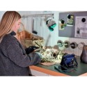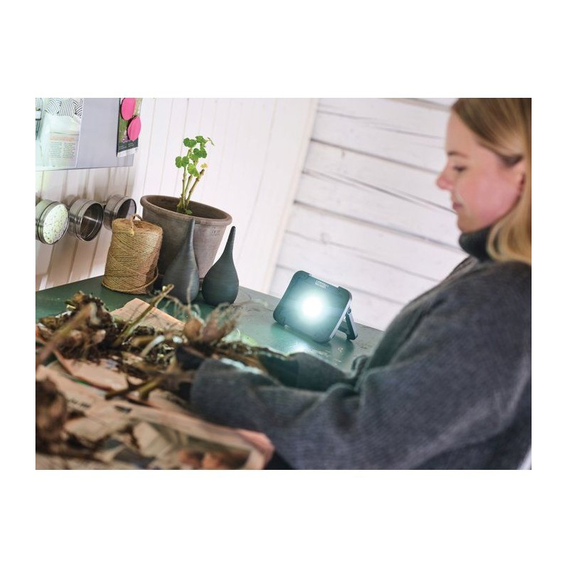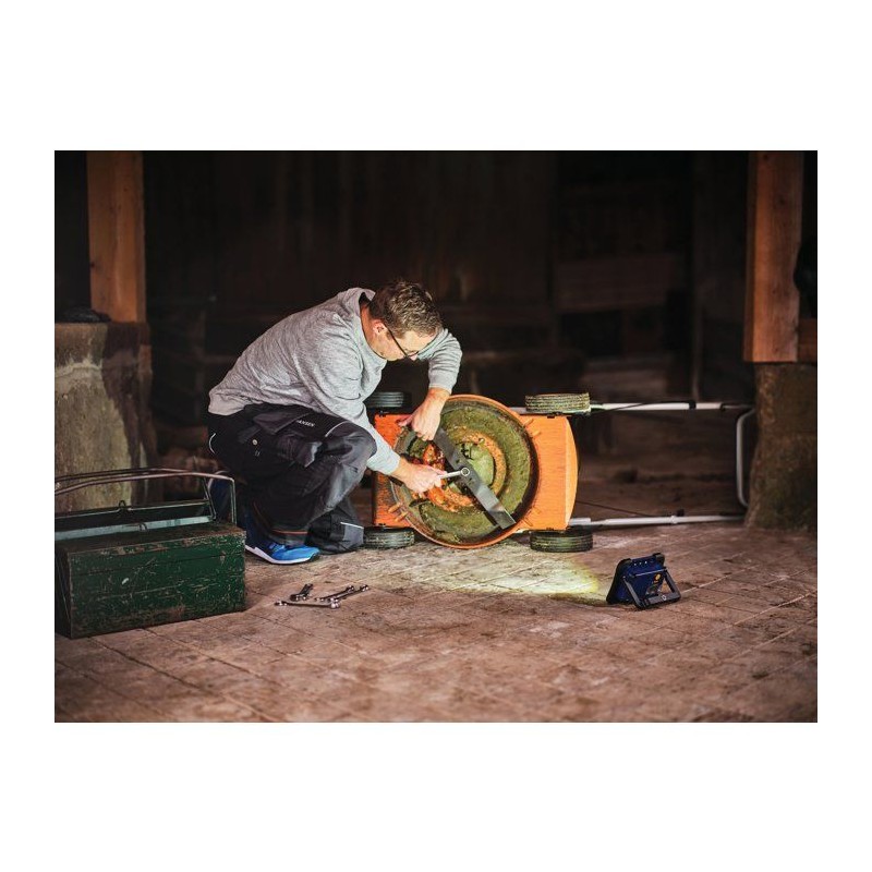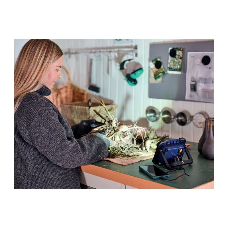 Lampe de travail portable 1000 lm, deux modes (100?%/50?%), idéale sans prise de courant. Recharge USB-C, autonomie 3?h. IP65 pour usage extérieur, support inclinable et fonction powerbank via USB-A. Compacte et facile a transporter.