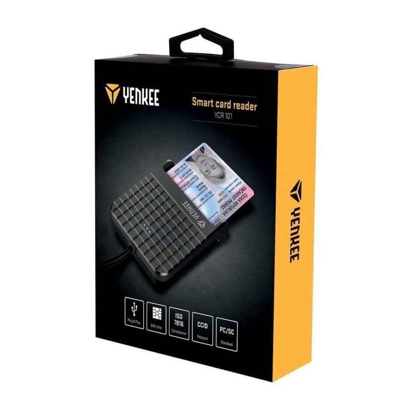 Le lecteur de carte a puce YENKEE YCR 101 assure des communications sécurisées pour e-gouvernement, e-banking et e-commerce. Il se connecte via USB 2.0, prend en charge les cartes a puce 5 V, 3 V et 1,8 V, et offre une vitesse de transmission de 12 Mbps. Dimensions : 81 x 57 x 13 mm, poids : 103 g.