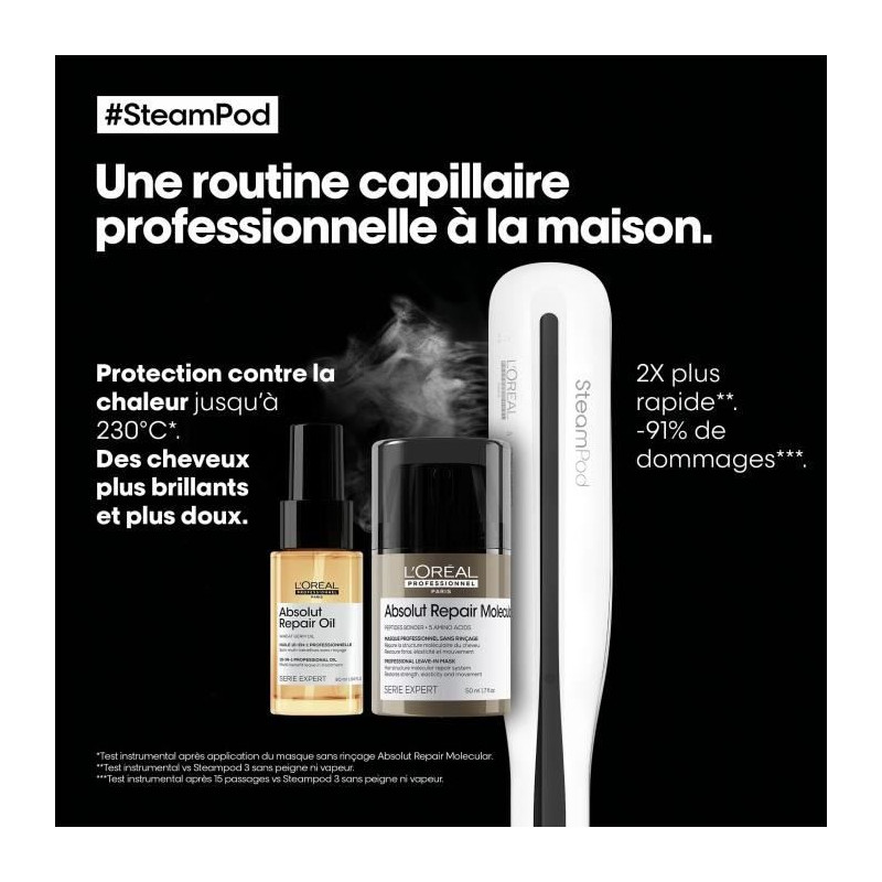 Découvrez le Steampod 3, un lisseur professionnel breveté qui métamorphose votre coiffure grâce a la puissance de la vapeur. En un instant, obtenez des résultats impeccables : une chevelure d'une douceur naturelle, des boucles parfaitement dessinées ou un effet wavy* sans effort. Cet appareil polyvalent rend toutes les audaces capillaires possibles ! Son secret réside dans un flux de vapeur continu qui pénetre délicatement la fibre capillaire pour l'assouplir. Ce procédé innovant permet de lisser plus rapidement tout en réduisant considérablement les dommages, jusqu'a 91%**. Pour l'accompagner, le masque sans rinçage Absolut Repair Molecular est thermo-protecteur et protege les cheveux des agressions extérieures et de la la chaleur jusqu'a 230°C ***. Ce masque reconstruit la structure moléculaire du cheveu****, restaure sa force, son élasticité et son mouvement naturel*****. Enfin, pour sublimer votre routine, utilisez l'Huile 10-en-1 Absolut Repair. Enrichie en huile de germe de blé, cette huile nourrit et protege vos cheveux afin de les rendre plus doux et brillants. Sans rinçage, elle est idéale en finition pour toutes les routines capillaires afin de prendre soin des cheveux normaux a sensibilisés. Développée par L'Oréal Professionnel Paris. *wavy = ondulations. **Test instrumental apres 15 passages vs Steampod 3 sans peigne ni vapeur. ***Test instrumental apres application du masque sans rinçage Absolut Repair Molecular. ****Test Instrumental apres 15 applications du Shampoing + Sérum a rincer + Masque sans rinçage Absolut Repair Molecular. *****Test consommateur apres 2 semaines d'utilisation du Shampoing + Sérum a rincer + Masque sans rinçage Absolut Repair Molecular.