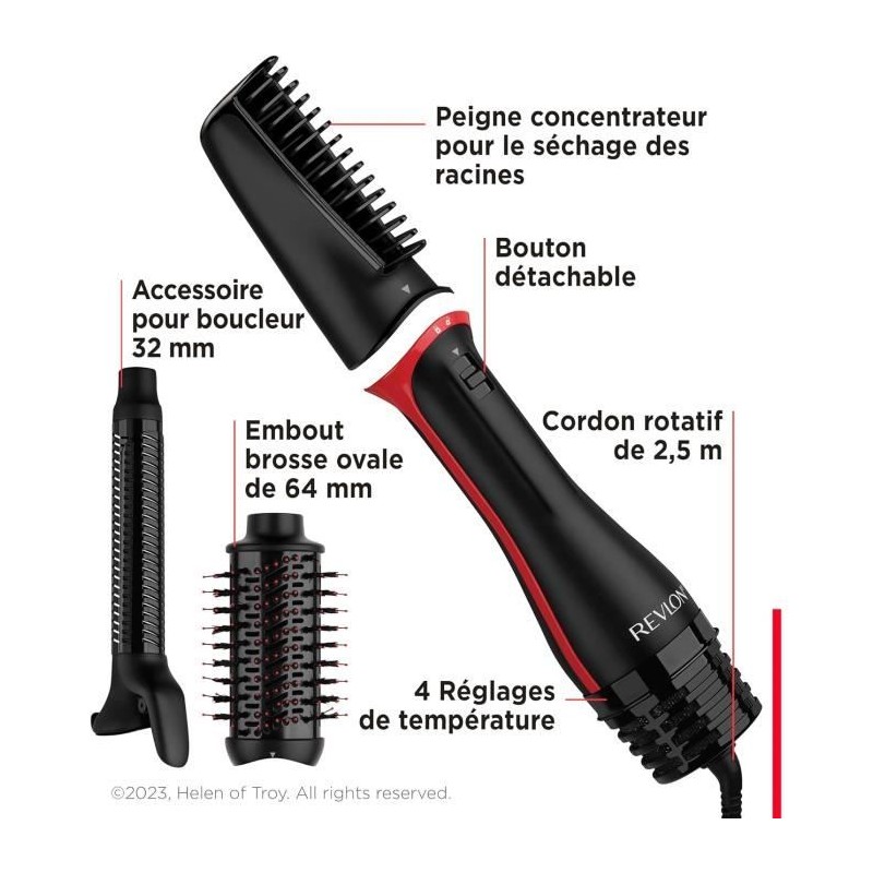 La brosse coiffante Revlon Multistyler One-Step RVDR5333 est un outil 3-en-1 qui permet de sécher, boucler et coiffer vos cheveux rapidement. Avec sa tete ovale de 64 mm et ses 4 températures réglables, elle s'adapte a tous les types de cheveux tout en préservant leur hydratation. Inclus : peigne concentrateur et fer a boucler.