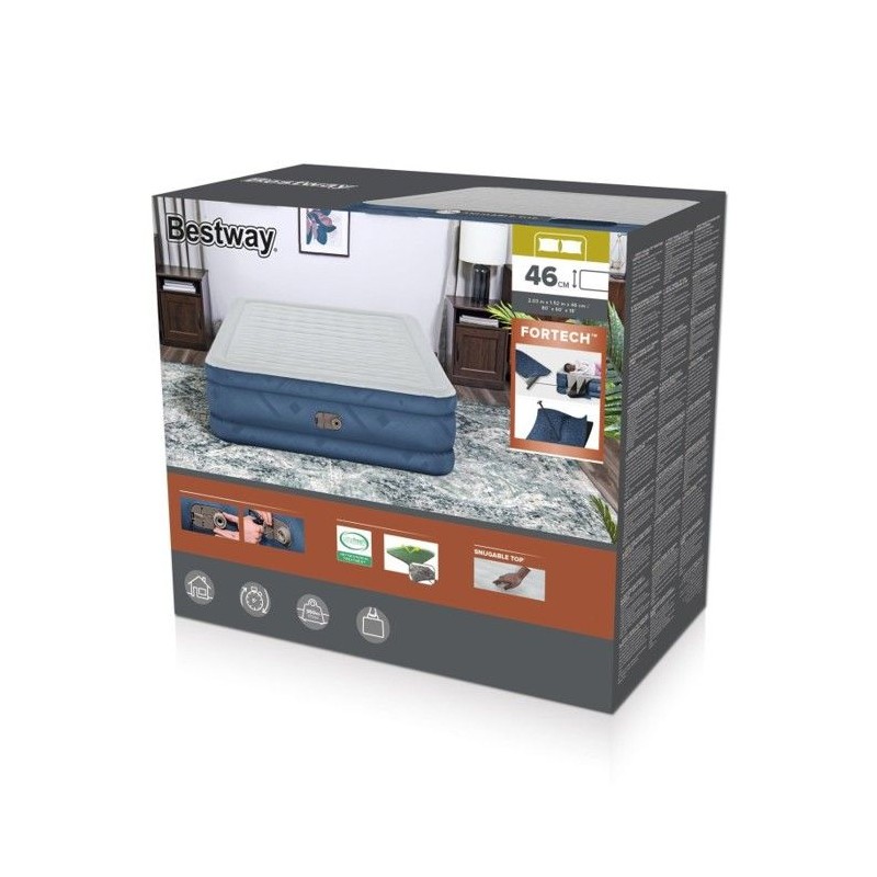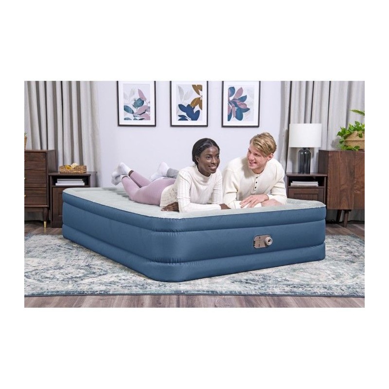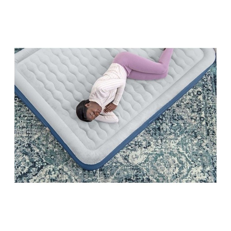 Robuste et confortable, le matelas gonflable en Bestway® Fortech® Snugable Top® présente une surface incroyablement douce au toucher qui résiste aussi aux déformations. Ce matelas 2 places Queen est robuste tout en étant léger, ce qui en fait un choix de premier ordre. Structure résistante : Conçu pour offrir une grande durée de vie, ce matelas gonflable est fabriqué en Fortech. Cette fusion de PVC et de polyester est plus résistante que le PVC traditionnel, tout en étant 10 % plus légere. Ce matériau durable est également 75 % plus résistant aux perforations, 92 % plus résistant a la déformation et 150 fois plus résistant aux éraflures. Vous vous sentirez a l'aise toute la nuit grâce au matériau tissé, spécialement conçu pour que le lit ne soit jamais trop chaud ni trop froid. Détendez-vous confortablement sur une agréable surface de couchage ondulée grâce a ses renforts internes qui contribuent a maintenir l'alignement de la colonne vertébrale et a soulager la pression pendant votre sommeil. Le design antiroulis du cadre enveloppant vous évitera de tomber du lit pendant la nuit. Surface au toucher doux ultra confortable : Doté d'une surface de couchage Snugable Top, ce lit est tout aussi confortable que résistant. Cette surface en flanelle luxueuse est douce au toucher et aide a retenir la chaleur corporelle toute la nuit. Spécialement conçu pour avoir la surface de couchage la plus douce, le matelas gonflable Snugable Top vous offrira, a vous et a vos invités, un confort inégalé. Montage facile : Gonflable en 5 minutes grâce a la pompe électrique intégrée, ce matelas sera pret a l'emploi des vos premiers bâillements. Le matin, la valve a vis de dégonflage rapide permet un dégonflage facile. Placez simplement votre matelas dégonflé et bien aplati dans le sac de transport inclus pour l'emporter avec vous ou le ranger facilement. Robuste et confortable, le matelas gonflable en Fortech Snugable Top de Bestway présente une surface incroyablement douce