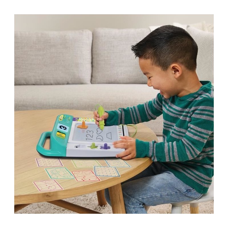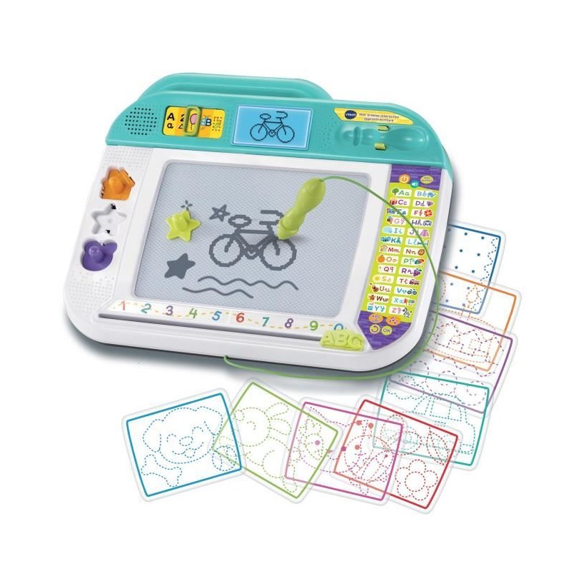 Mon ardoise interactive apprenti-écriture - 3 - 7 ans Une ardoise interactive pour apprendre a dessiner et écrire en s'amusant ! Une grande surface de dessin avec un stylet et son support de rangement, 3 tampons formes et 8 pochoirs pour dessiner et développer sa créativité. Une gomme pour effacer le dessin comme pa