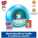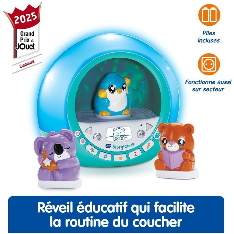 Story'Clock - Ma conteuse-réveil (bleu) - 3 - 8 ans Idéale pour instaurer une routine du coucher, cette conteuse combine lumieres apaisantes, personnages thématiques, contenu audio riche et coach de sommeil pour accompagner l'enfant vers un sommeil serein. 3 personnages thématiques : Chaque personnage déclenche des