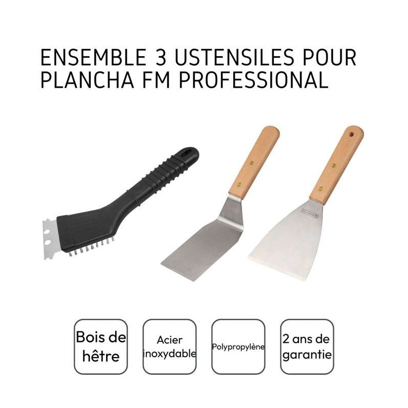 FM Professional propose cet ensemble de 3 ustensiles spécial Plancha avec 2 spatules et 1 racloir pour un nettoyage optimal de votre plancha. LE PETIT + : Economisez du temps et de l'argent grâce a ce lot, vous retrouvez vos ustensiles préférés en un seul achat !. COMPOSITION et ENTRETIEN : Racloir : Plastique | Spatules : Bois de hetre, Acier inoxydable | Le racloir ne convient pas au lave-vaisselle. DIMENSIONS : Racloir : 22 cm | Spatule coudée : 27,5 x 7 | Spatule plate : 23,5 x 12 cm CONTENU : 1x racloir + 1x spatule coudée + 1x spatule plate | Garantie 2 ans Cet ensemble de 3 ustensiles  FM Professional est parfait pour vos repas réalisés a la plancha , que ce soit entre amis ou en famille tout le monde se régale grâce a al cuisson saine de la plancha. Ne prenez aucun risque de rayure grâce a ces 2 spatules et optez pour le racloir pour le nettoyage, c'est la garantie d'une plancha qui dure ! FM Professional est une marque du groupe Fackelmann, destinée aux professionnels de la cuisine et de la pâtisserie. FM Professional regroupe des ustensiles de cuisine et de pâtisserie par lots qui sont intéressants pour les professionnels du secteur. Les ustensiles de pâtisserie et de cuisine proposés par FM Professional sont fabriqués en acier inoxydable de haute qualité et sont tres résistants. La marque souhaite apporter la qualité des ustensiles professionnels dans toutes les cuisines.