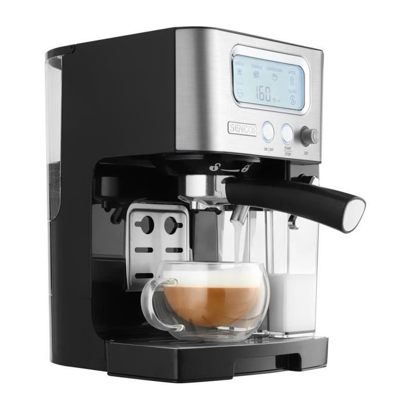 Découvrez la machine a expresso Sencor SES 4090SS, semi-automatique avec pompe de 15 bars. Profitez d'un café parfait grâce a son grand écran LCD, son systeme de chauffage Thermoblock et sa fonction d'auto-nettoyage. Réservoir d'eau de 1,4 l et plusieurs programmes pour espresso, cappuccino et plus.