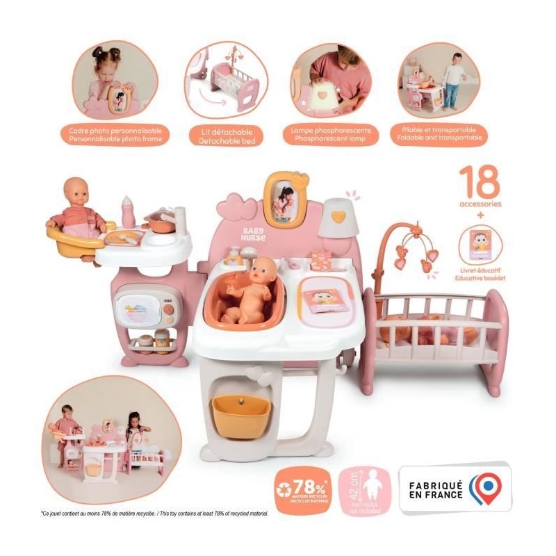 La grande maison des bébés offre a votre enfant un grand espace pour jouer a la maman et au papa ! Votre enfant pourra s'occuper de son poupon pendant de longues heures de jeux grâce aux 3 pieces différentes dédiées au bien-etre de son petit : cuisine, salle de bain et chambre ! Pratique, la maison se range facilement grâce a ses espaces de jeux repliables et a ses roulettes !Votre petit pourra commencer par donner a manger a son poupon dans le coin cuisine, et ensuite faire un petit tour du côté de la salle de bain pour le changer et le laver. Enfin il suffira de border bébé, et de lui lire une histoire a la lueur de la lampe phosphorescente pour qu'il s'endorme ! La maison comporte de nombreux accessoires pour agrémenter les fonctions de jeu : 1 faitout, 1 assiette, 1 cuillere, 1 biberon, 1 brosse a dents, 1 petit pot, 1 thermometre mécanique, 1 flacon pousse-mousse, 1 douchetut, 1 assiette, 1 cuillere, 1 biberon, 1 brosse a dents, 1 petit pot, 1 thermometre mécanique, 1 flacon pousse-mousse, 1 douchette avec action mécanique, 1 boite de pansements et des planches de pansements, 1 flacon de talc factice, 1 livret pour apprendre a prendre soin de bébé. Grâce a la diversité de ses fonctions de jeux, cette maison pour poupons aura tout pour plaire a votre enfant ! Elle lui permettra d'imaginer mille histoires et situations différentes ! Poupon non inclus. Cadre photo personnalisable. Ce produit contient 78% de matiere recyclée. A partir de 3 ans - Fabrication française.