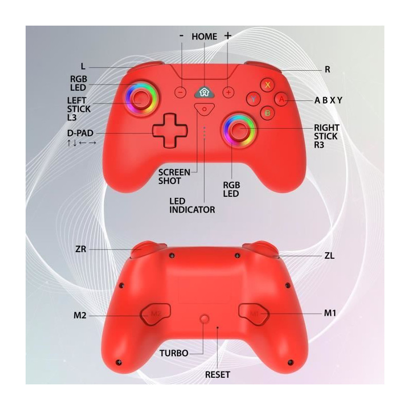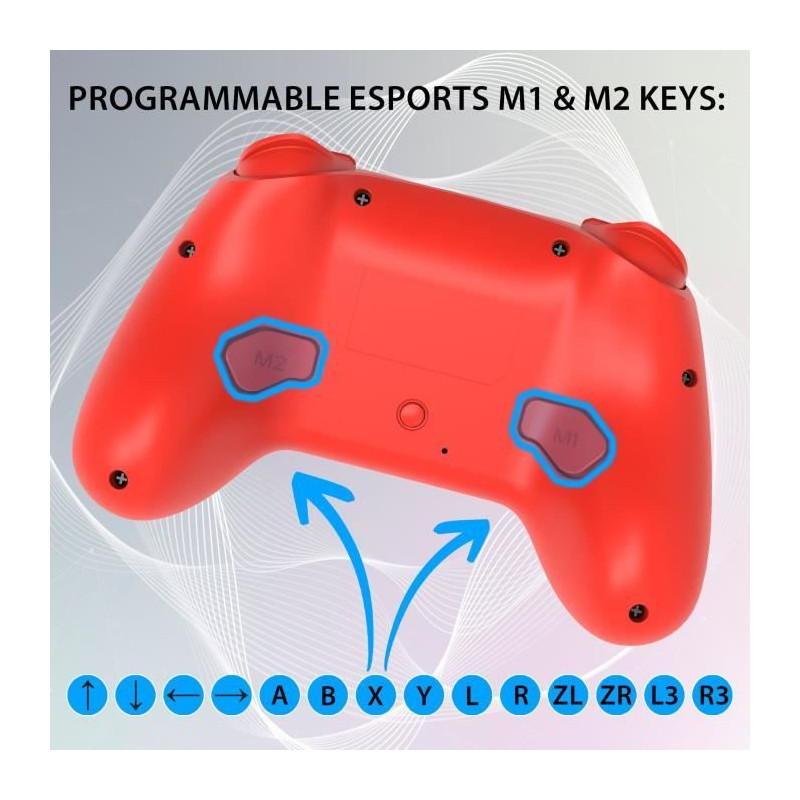 La Manette sans fil Switch 2 et Switch de SUBSONIC reproduit les memes fonctions que la manette Switch pro controller. Grâce a son desing ergonomique, elle offre une tres bonne prise en main bien plus confortable que les joy con Switch pour jouer a plusieurs. Cette manette pour Switch offre une autonomie de 9h / 10h de jeu. Un câble de recharge usb-c est livré avec pour la recharger. Une manette complete : La manette Wireless Led controller est équipé de capteurs de mouvement (Gyroscope 6 axes et accélérometre) afin de jouer a Mario kart world deluxe simplement en penchant la manette comme avec les joy-con Switch. Elle est également équipée de LEDs programmables et offre un look vraiment fun et sympa. Cette manette pour console Switch / Switch 2 de Nintendo propose 3 niveaux de vibrations. Elle permet en effet de régler l'intensité des vibrations et s'adapte parfaitement a votre style de jeu. Pour les fans de FPS de esport, SUBSONIC propose avec cette manette bluetooth pour Switch 2 boutons supplémentaires M1 et M2 situés a l'arriere de la manette pour améliorer la performance de jeu. Ces 2 boutons sont programmables et peuvent reproduite tous les autres boutons. La manette pro de SUBSONIC propose également une fonction turbo idéal pour les jeux a plusieurs come Mario Party.