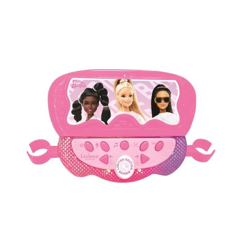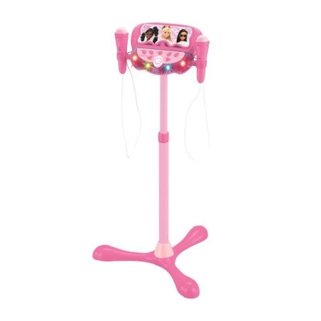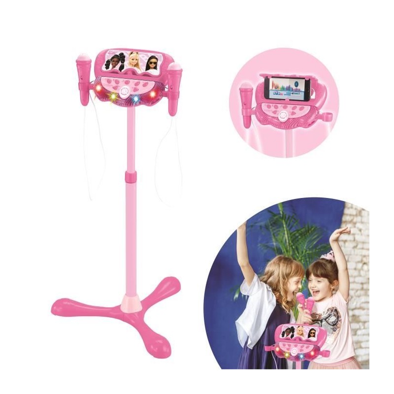 Prépare-toi pour la scene avec le microphone Barbie ! Ajustable de 60 a 95 cm, il inclut 2 micros pour chanter en duo et une enceinte Bluetooth avec effets lumineux. Connecte ton lecteur audio via Aux-in et enregistre ta performance. Support pour téléphone inclus. Alimentation par 3 piles AA (non fournies).
