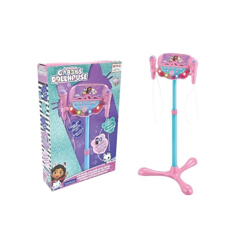 Microphone Gabby et la maison magique sur pied ajustable lumineux avec enceinte, 2 Micros et Effets vocaux, Enceinte Bluetooth