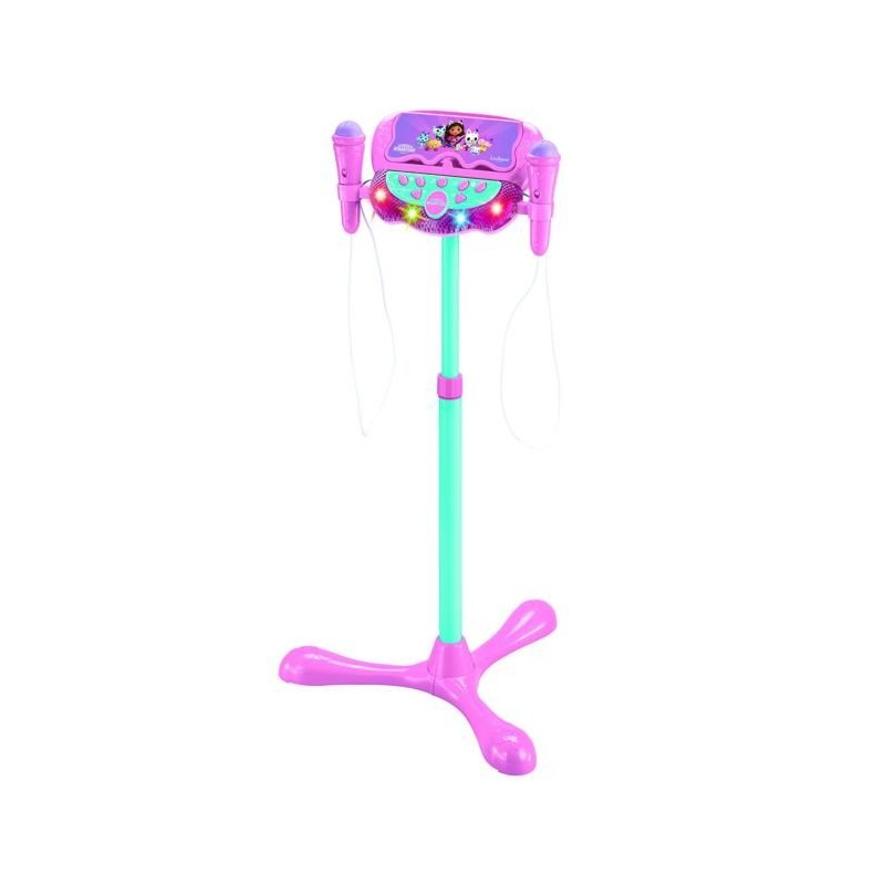 Prépare-toi a chanter avec le microphone Gabby et la maison magique ! Ce microphone sur pied ajustable inclut 2 micros, une enceinte Bluetooth et des effets lumineux. Connecte ton lecteur audio via Aux-in et enregistre tes performances. Idéal pour les enfants a partir de 3 ans.