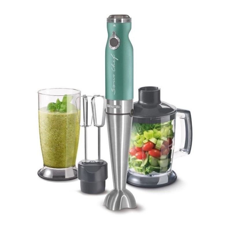 MIXEUR PLONGEANT Sencor SHB 5601GR-EUE3 - Mixeur plongeant 4 en 1 GARANTIE DE 6 ANS pour le moteur Technologie TITANIUM QuadBlade Puissance d'entrée 1 200 W Moteur CC ultra silencieux Contrôle de vitesse continu (20 vitesses) Poignée ergonomique Accessoire en acier inoxydable qui peut également etre utilisé pour mélanger des aliments chauds Lame de hachage en acier inoxydable Accessoires : gobelet de 800 ml avec couvercle, double fouet en acier inoxydable, 1 hachoir de 250 ml avec lames en acier inoxydable Boutons de déverrouillage des accessoires Boucle de suspension Longueur du cordon d'alimentation : 1,2 m