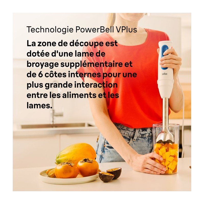 Découvrez la puissance et la précision avec le mixeur plongeant Braun MultiQuick MQ30001M. Son moteur de 900 W garantit des préparations rapides et homogenes, meme pour les ingrédients les plus résistants. Grâce a la technologie PowerBell VPlus, obtenez des résultats jusqu'a 4 fois plus fins pour des soupes, purées et smoothies parfaitement lisses. Le systeme SplashControl évite les éclaboussures pour une cuisine toujours propre. Avec ses 2 vitesses et le systeme EasyClick Plus, changez d'accessoires en un clic pour une polyvalence maximale. Les pieces compatibles lave-vaisselle facilitent le nettoyage. Un allié indispensable pour des recettes créatives et réussies au quotidien !