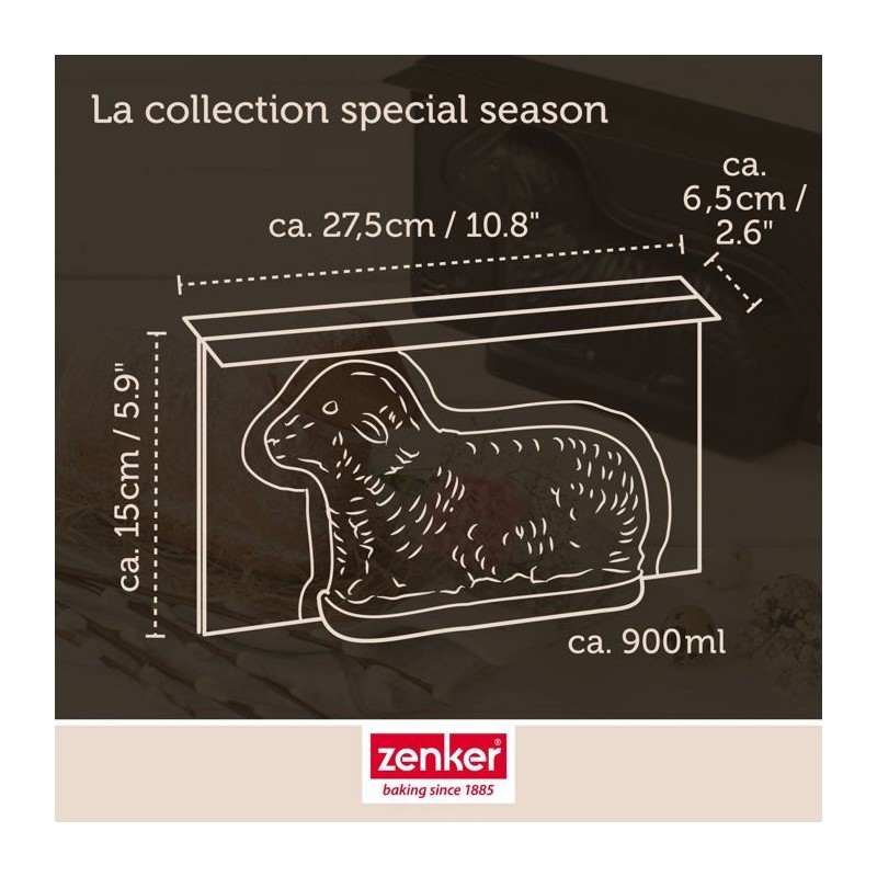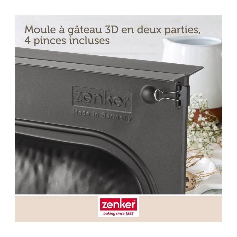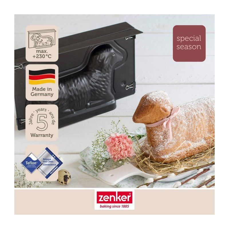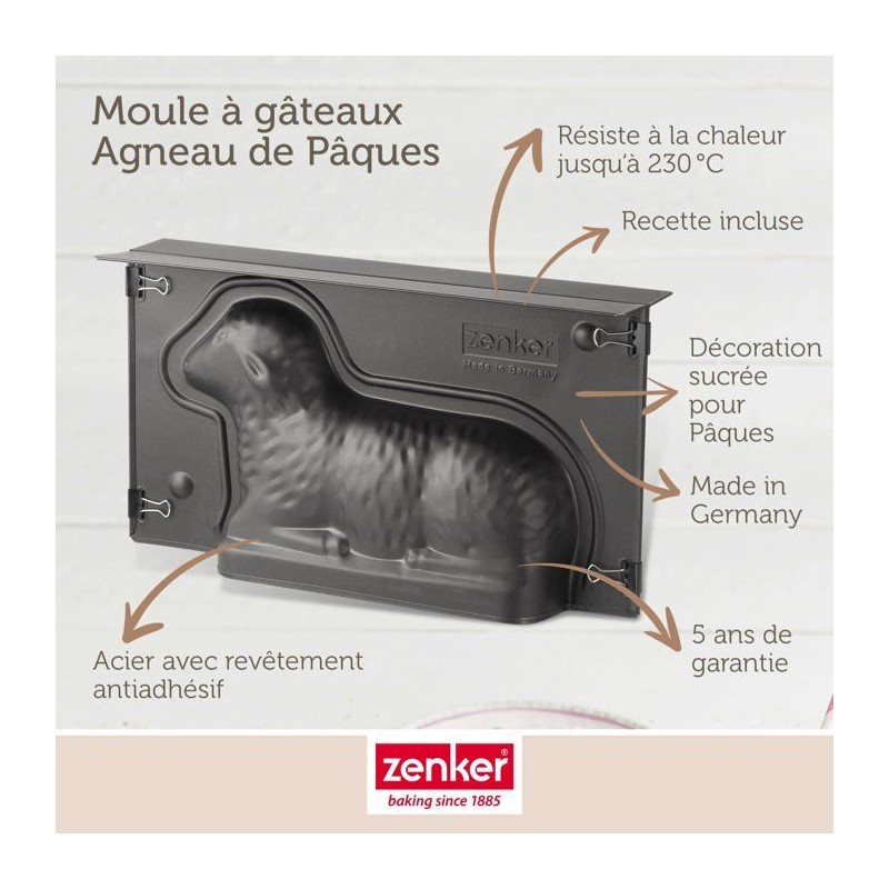 Zenker vous propose ce lot de 2 moules a gâteaux 3D en forme d'agneau pascal aussi appelés moules a lammele qui est un gâteau traditionnel alsacien qui se déguste a Pâques. LE PETIT + : Innovez pour Pâques en préparant un sublime lamala, petit agneau de Pâques, recouvert de sucre glace afin de ravir les yeux et les papilles. COMPOSITION : Fabriqué en Allemagne, le moule 3D est en acier avec un revetement antiadhésif en téflon Classic, il dispose également de pinces permettant la fermeture du moule pour la cuisson. DIMENSIONS : D'une capacité de 900 ml, ce moule 3D agneau mesure 27,5 cm de longueur, 15 cm de hauteur et 6,5 cm d'épaisseur, idéal pour un bel agneau de Pâques a poser sur votre table. UTILISATION : Ce moule a gâteau en forme d'agneau pascal passe au four jusqu'a 230°C, il se nettoie facilement a la main et vous permettra a coup sûr de réussir votre dessert de Pâques Zenker est une marque faisant partie du groupe Fackelmann Brands et elle propose une large gamme d'ustensiles de pâtisserie et de moules a gâteaux. Concernant les ustensiles de pâtisserie, Zenker frappe fort en mettant a disposition des ustensiles de préparation mais aussi de décoration pour les pâtissiers confirmés. Côté moules a gâteaux c'est une marque pionniere qui propose des innovations telles que les moules a gâteaux en silicone et fibre de verre ne nécessitant pas de matiere grasse et proposant des résultats de cuisson incroyables. Zenker possede donc une large gamme d'accessoires et d'ustensiles pour vous accompagner dans vos recettes du quotidien mais aussi pour des évenements exceptionnels comme les fetes, les anniversaires, les mariages, etc.