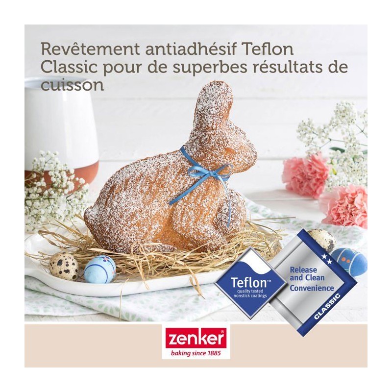 Zenker vous propose ce lot de 2 moules lapin de Pâques 3D, idéal pour préparer de délicieux gâteaux pour Pâques et notamment le fameux lammele alsacien. LE PETIT + : Ce moule a gâteaux en 3 dimensions vous offre la possibilité de garnir le centre du lapin avec des petits oeufs en chocolat pour un effet amusant et festif. COMPOSITION : Le moule a gâteau 3D est fabriqué en Allemagne, en acier avec un revetement antiadhésif en Téflon Classic pour un démoulage facile, il est muni de pinces pour bien fermer le moule lamele lors de la cuisson. DIMENSIONS : Ces deux moules a gâteaux sont identiques et mesurent 21,5 x 19 x 6 cm, ce qui est parfait pour un petit lamele de Pâques afin de suivre la tradition alsacienne. UTILISATION : Le moule lapin de Pâques a une capacité de 600 ml, il passe au four jusqu'a 230°C pour un gâteau parfaitement cuit, il se nettoie facilement a la main grâce au revetement antiadhésif Zenker est une marque faisant partie du groupe Fackelmann Brands et elle propose une large gamme d'ustensiles de pâtisserie et de moules a gâteaux. Concernant les ustensiles de pâtisserie, Zenker frappe fort en mettant a disposition des ustensiles de préparation mais aussi de décoration pour les pâtissiers confirmés. Côté moules a gâteaux c'est une marque pionniere qui propose des innovations telles que les moules a gâteaux en silicone et fibre de verre ne nécessitant pas de matiere grasse et proposant des résultats de cuisson incroyables. Zenker possede donc une large gamme d'accessoires et d'ustensiles pour vous accompagner dans vos recettes du quotidien mais aussi pour des évenements exceptionnels comme les fetes, les anniversaires, les mariages, etc.