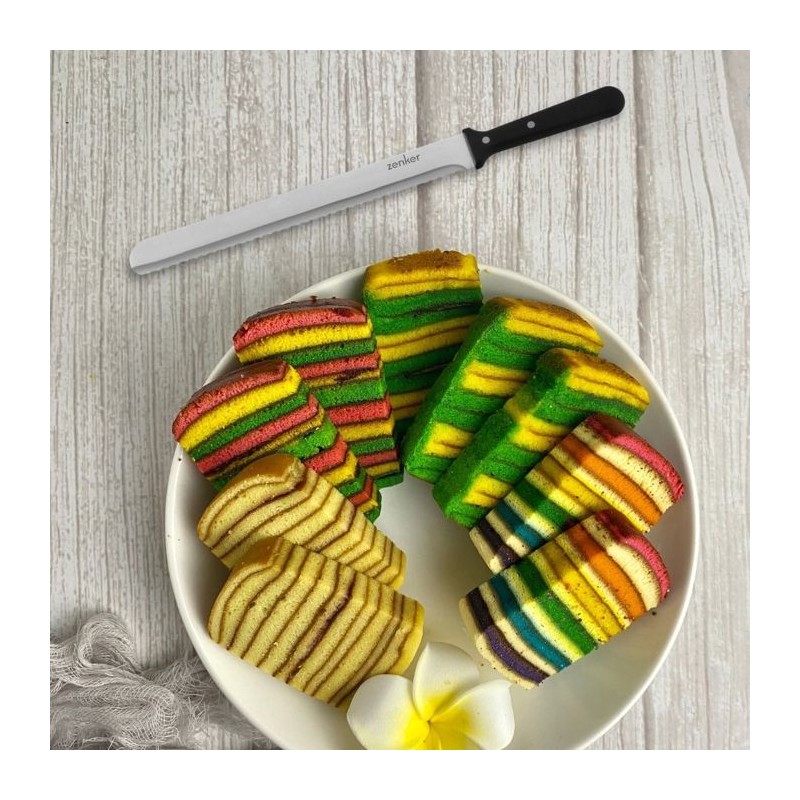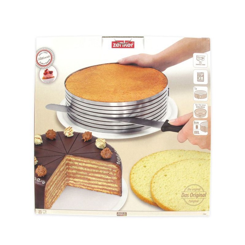 Ensemble de 2 ustensiles de pâtisserie avec couteau professionnel et cercle a trancher les gâteaux, idéal pour les cakes designs et autres gâteaux multicouches. LE PETIT + : Découpez vos gâteaux en cercles parfaitement égaux et obtenez une découpe nette grâce a cet ensemble. COMPOSITION et ENTRETIEN : Couteau : Plastique, acier inoxydable, Cercle a trancher : Acier inoxydable | Les 2 ustensiles sont compatibles au lave-vaisselle. DIMENSIONS : Couteau : 30 cm | Cercle a trancher : diametre 26 et 28 cm CONTENU : 1x couteau professionnel + 1x cercle a pâtisserie réglable pour trancher les gâteaux Cet ensemble de 2 ustensiles de pâtisserie se compose   d'un trancheur a gâteau réglable et d'un couteau professionnel de 30 cm. Il vous permettra de trancher un gâteau dans la hauteur afin de réaliser plusieurs couches et de garnir de creme, de ganache ou de confiture l'espace entre chaque couche de gâteau. Cet ensemble d'ustensile de pâtisserie est idéal pour avoir des couches égales de gâteau. Zenker est une marque faisant partie du groupe Fackelmann Brands et elle propose une large gamme d'ustensiles de pâtisserie et de moules a gâteaux. Concernant les ustensiles de pâtisserie, Zenker frappe fort en mettant a disposition des ustensiles de préparation mais aussi de décoration pour les pâtissiers confirmés. Côté moules a gâteaux c'est une marque pionniere qui propose des innovations telles que les moules a gâteaux en silicone et fibre de verre ne nécessitant pas de matiere grasse et proposant des résultats de cuisson incroyables. Zenker possede donc une large gamme d'accessoires et d'ustensiles pour vous accompagner dans vos recettes du quotidien mais aussi pour des évenements exceptionnels comme les fetes, les anniversaires, les mariages, etc.