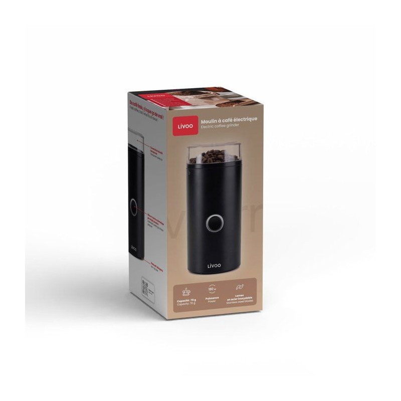 Préparez un café fraîchement moulu avec le moulin LIVOO DOD219N. Lames en acier inoxydable pour un broyage précis, puissance 180 W et capacité pour 12 tasses. Mise en marche par simple pression, couvercle de sécurité et pieds antidérapants pour un usage sûr et pratique.