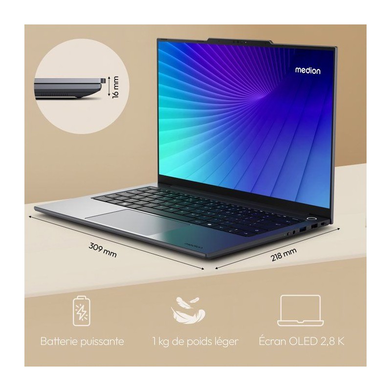 PC Portable MEDION - Signium 14 S1 - 14 - 2,8K OLED - 120Hz - Core 5-120U - RAM 16 Go - SSD 512 Go - Sans OS