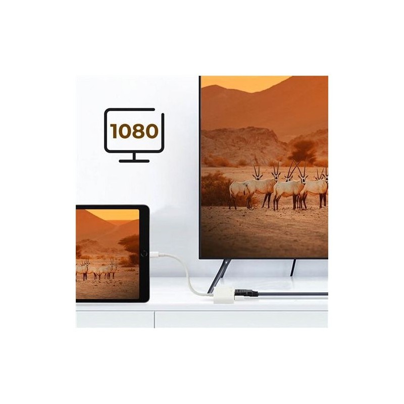 Utilisez l'Adaptateur Lightning AV numérique pour votre iPhone, iPad ou iPod avec connecteur Lightning. L'adaptateur Lightning AV numérique permet la recopie vidéo de ce qui s'affiche sur l'écran de votre appareil (y compris applis, présentations, sites web, diaporamas et autres) sur votre téléviseur, projecteur ou tout autre écran compatible équipé d'un port HDMI, jusqu'en HD 1080p.