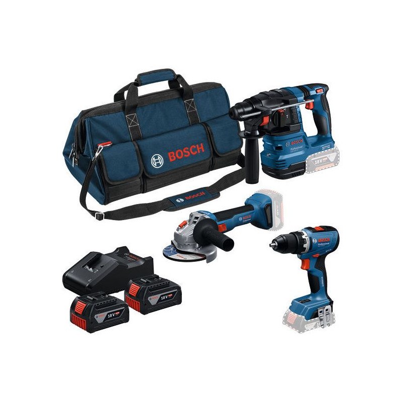 Pack professionnel BOSCH 3 outils 18V (modele 0615A50094) comprenant : perceuse-visseuse GSR, meuleuse angulaire GWS 125 mm et perforateur GBH, livré avec 2 batteries 4 Ah et chargeur. Ensemble sans fil de la gamme Professional offrant puissance et ergonomie pour chantiers exigeants. Le perforateur GBH 18V-22 dispose d'un moteur brushless avec Constant Speed, systeme KickBack Control et Vibration Control pour plus de sécurité et de confort, et permet un travail sans poussiere avec dispositif d'aspiration compatible. La meuleuse GWS 18V-8, compacte, équivaut a 800 W filaire pour tronçonnage et meulage légers. Perceuse-visseuse GSR adaptée au vissage et perçage polyvalent. Idéal pour usage professionnel : plus de trous par charge, mobilité complete grâce a l'alimentation 18V, batteries Bosch Professional 18V System incluses.