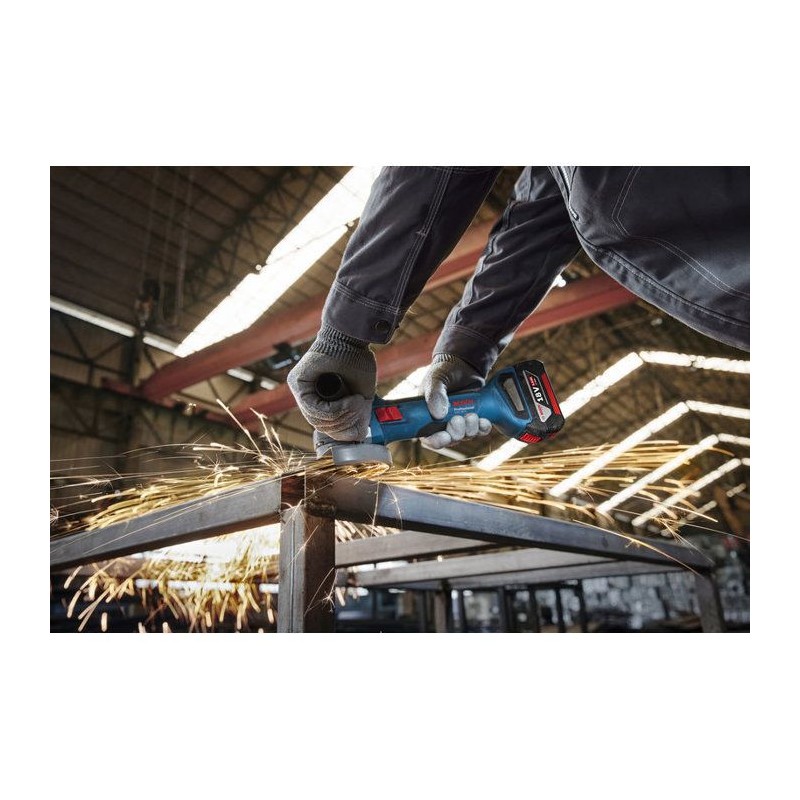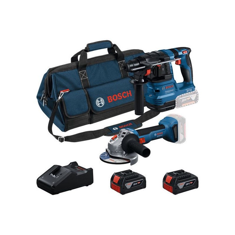 Kit professionnel Bosch 0615V0003C : pack 2 outils sans fil 18 V pret a l'emploi pour perçage et découpe. Comprend : perforateur SDS-plus GBH 18V-22 (1,9 J, moteur brushless, compact, compatible aspiration), meuleuse angulaire GWS 18V-7 (diam. disque 125 mm, équivalent 700 W, 11 000 tr/min, ergonomique), 2 batteries GBA 18V 5,0 Ah (CoolPack), chargeur rapide GAL 18V-40 et sac a outils renforcé (polyester, fond rigide, 480×280×300 mm). Idéal pour chantiers et usage professionnel : perçage béton/maçonnerie, découpe et ébarbage métal. Compatible avec l'écosysteme Bosch Professional 18V.