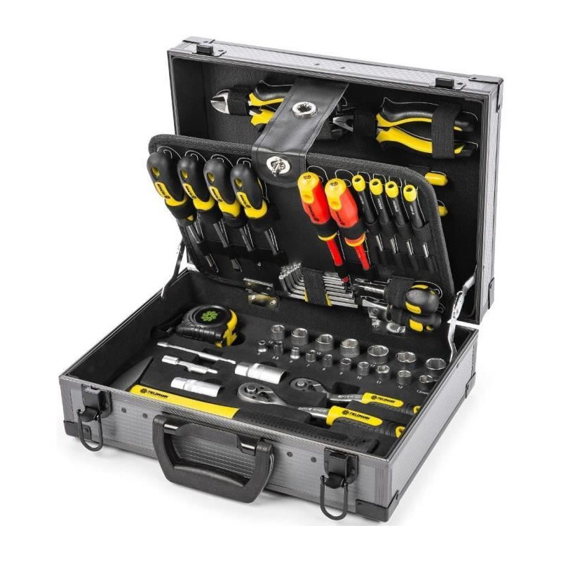 Découvrez l'ensemble d'outils Fieldmann FDG 5021-114R, comprenant 138 pieces essentielles pour tous vos travaux. Ce kit complet inclut des pinces, des tournevis, une clé a molette, un niveau a bulle, un metre et bien plus, le tout rangé dans une mallette en métal robuste. Idéal pour les bricoleurs et professionnels.