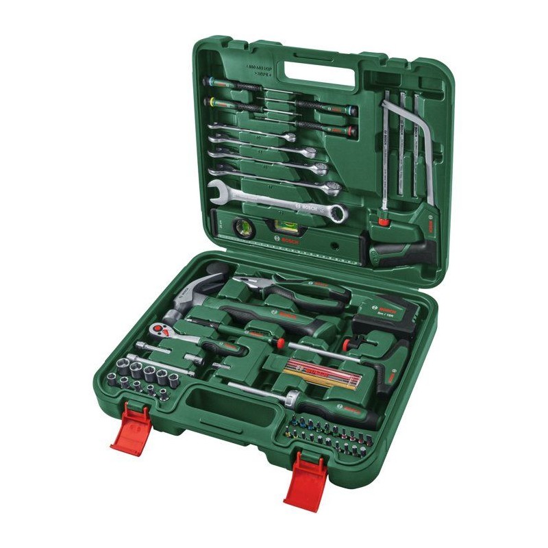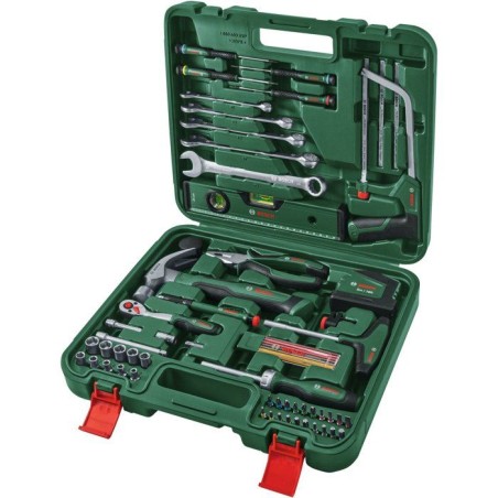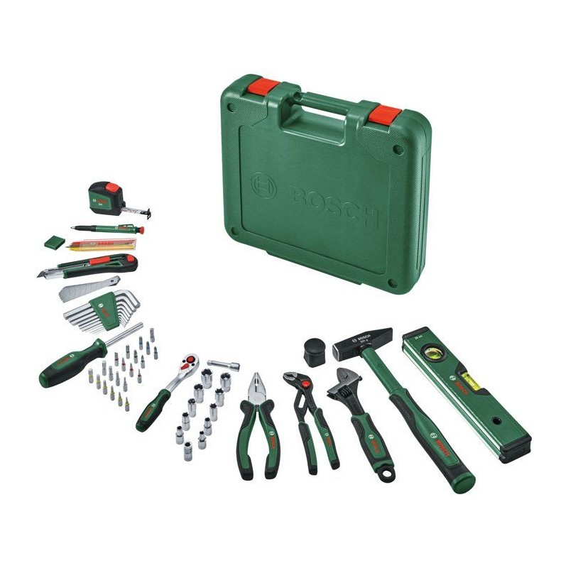 Le jeu d'outils a main Bosch de 63 pieces constitue le choix parfait pour les bricoleurs expérimentés qui attachent une grande importance a la précision, aux performances et au confort. Ce kit complet est conçu pour une grande variété d'applications, notamment pour les réparations, la maintenance, la fabrication de meubles et les projets de construction a domicile. Fourni avec un robuste coffret de transport, ce jeu comprend une scie a métaux avec lames de rechange, divers tournevis et clés, une pince, un cliquet 1/4", des douilles, un marteau arrache-clous avec amortisseur amovible et embouts. Il inclut aussi un metre ruban pratique, un niveau a bulle et un marqueur de trous profonds pour des résultats d'une grande précision. Conçus pour durer, ces outils ergonomiques sont constitués de matériaux de grande qualité pour un grand confort et une bonne maîtrise.